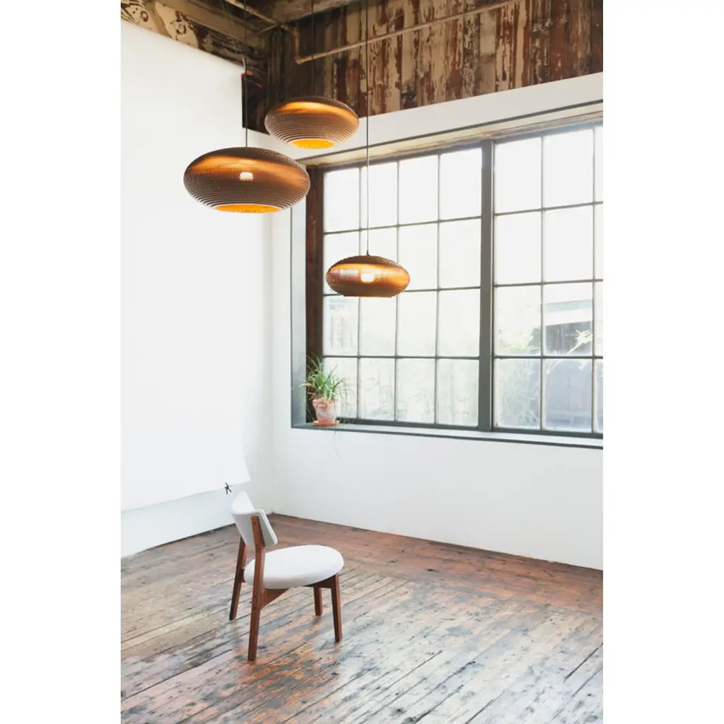 The Disc pendant by Graypants emits a soft, glare-free light that creates a warm and welcoming atmosphere for any space and occasion. The corrugations of the pendant’s oval cardboard shade filter light in a fascinating way and give the lamp a unique texture and appearance also when the light is turned off. Disc is part of Graypants’ Scraplights collection that features distinctive luminaires made of recycled corrugated cardboard. The material is laser-cut and assembled into the desired shape by hand, using a non-toxic adhesive, and finished with a non-toxic flame retardant. Unique and sustainably manufactured, the Scraplights pendants add a natural, organic touch to any interior both individually and in clusters.