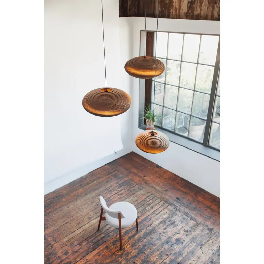 The Disc pendant by Graypants emits a soft, glare-free light that creates a warm and welcoming atmosphere for any space and occasion. The corrugations of the pendant’s oval cardboard shade filter light in a fascinating way and give the lamp a unique texture and appearance also when the light is turned off. Disc is part of Graypants’ Scraplights collection that features distinctive luminaires made of recycled corrugated cardboard. The material is laser-cut and assembled into the desired shape by hand, using a non-toxic adhesive, and finished with a non-toxic flame retardant. Unique and sustainably manufactured, the Scraplights pendants add a natural, organic touch to any interior both individually and in clusters.