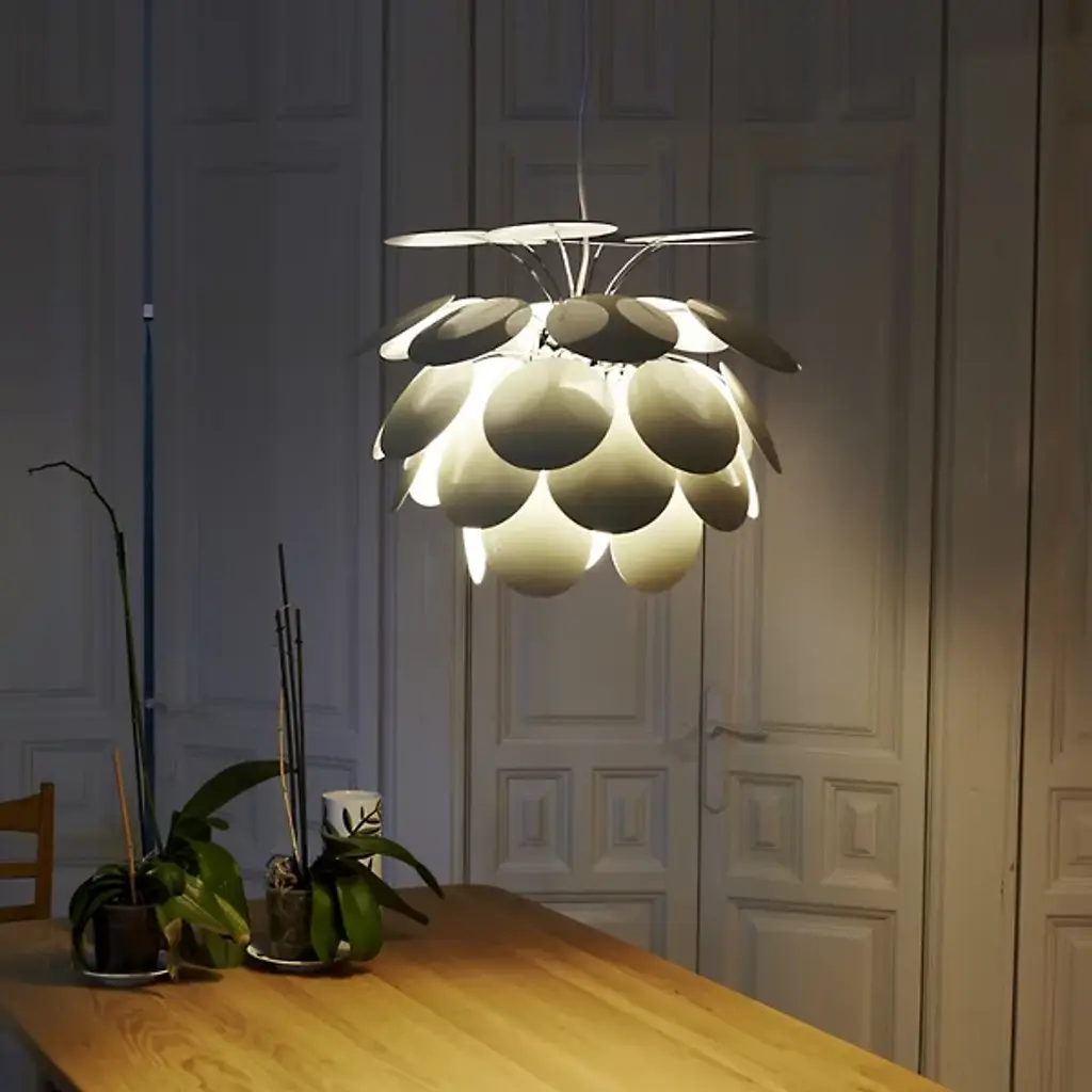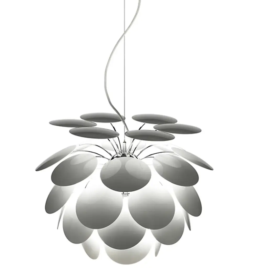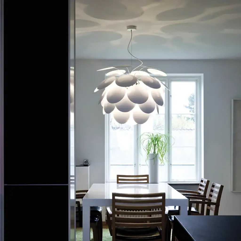 Designed by Christophe Mathieu, the Marset Discoco Pendant consists of a series of lacquered discs that float around a chromed semi-sphere. The discs act as layers that shield the light source while at the same time redirecting and reflecting the light onto the underlying discs. The result is a distinct and unique light which fills and enriches any space.