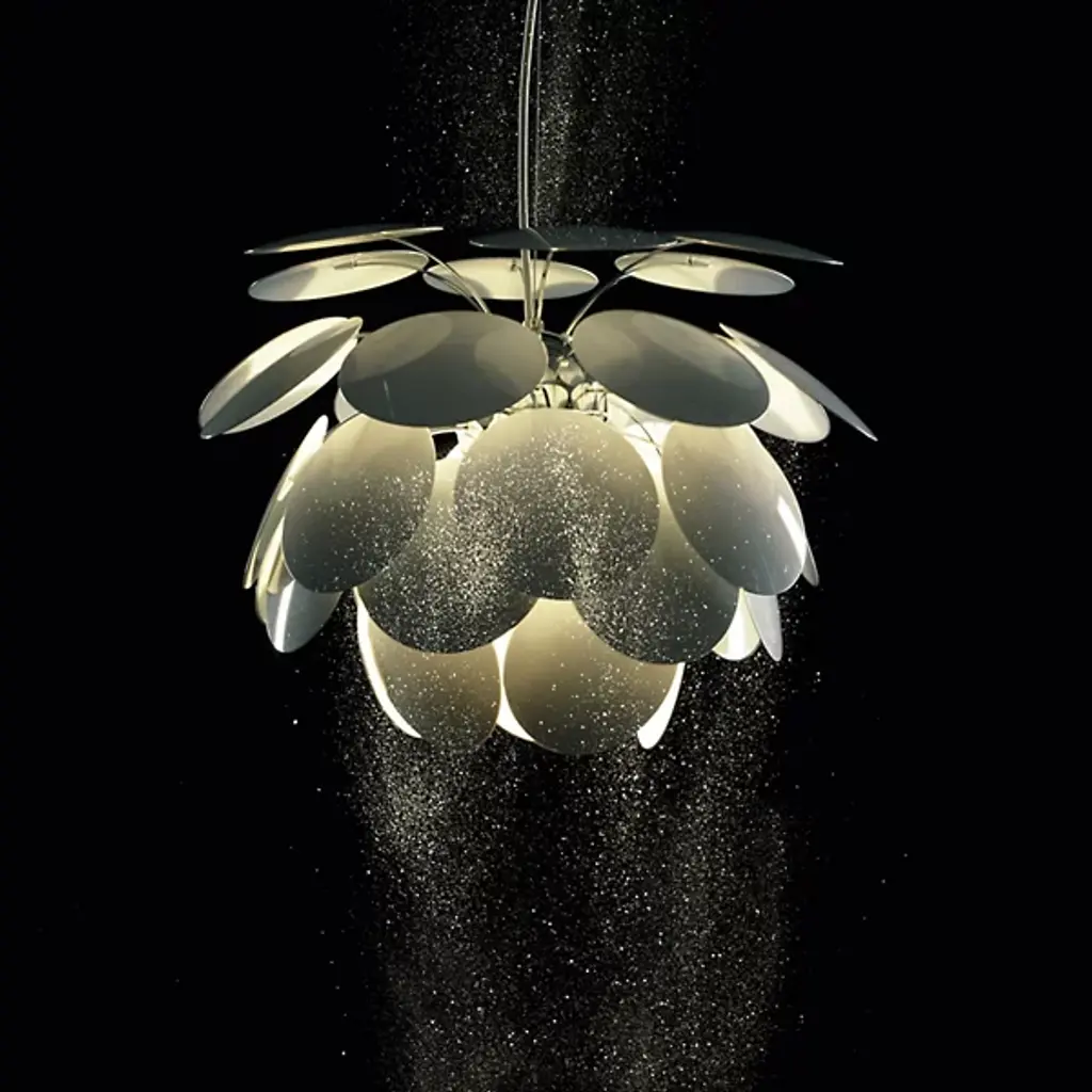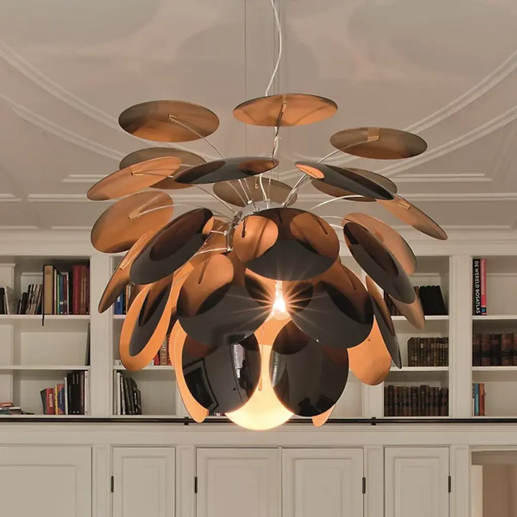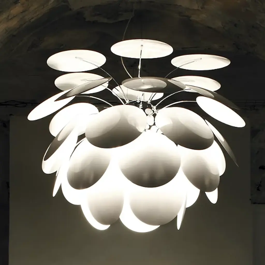 Designed by Christophe Mathieu, the Marset Discoco Pendant consists of a series of lacquered discs that float around a chromed semi-sphere. The discs act as layers that shield the light source while at the same time redirecting and reflecting the light onto the underlying discs. The result is a distinct and unique light which fills and enriches any space.