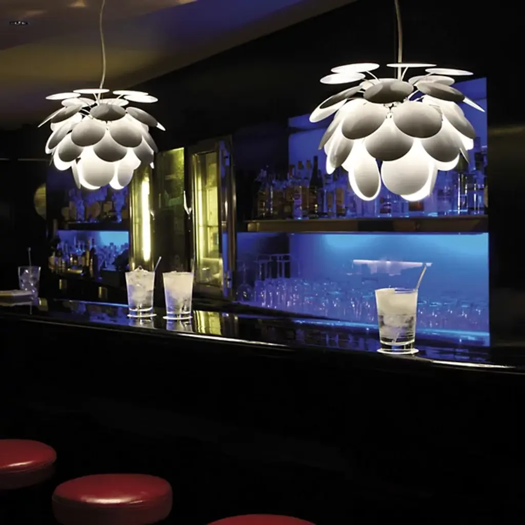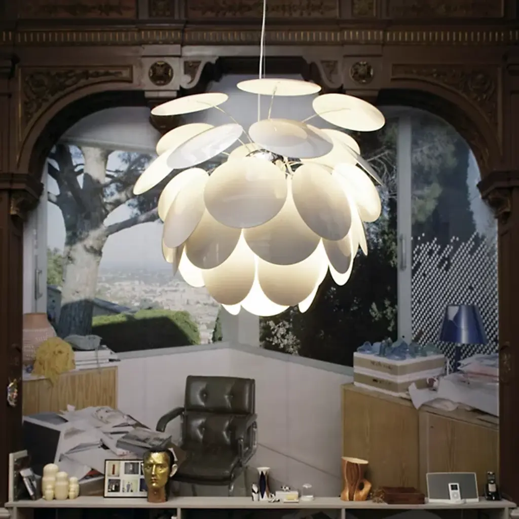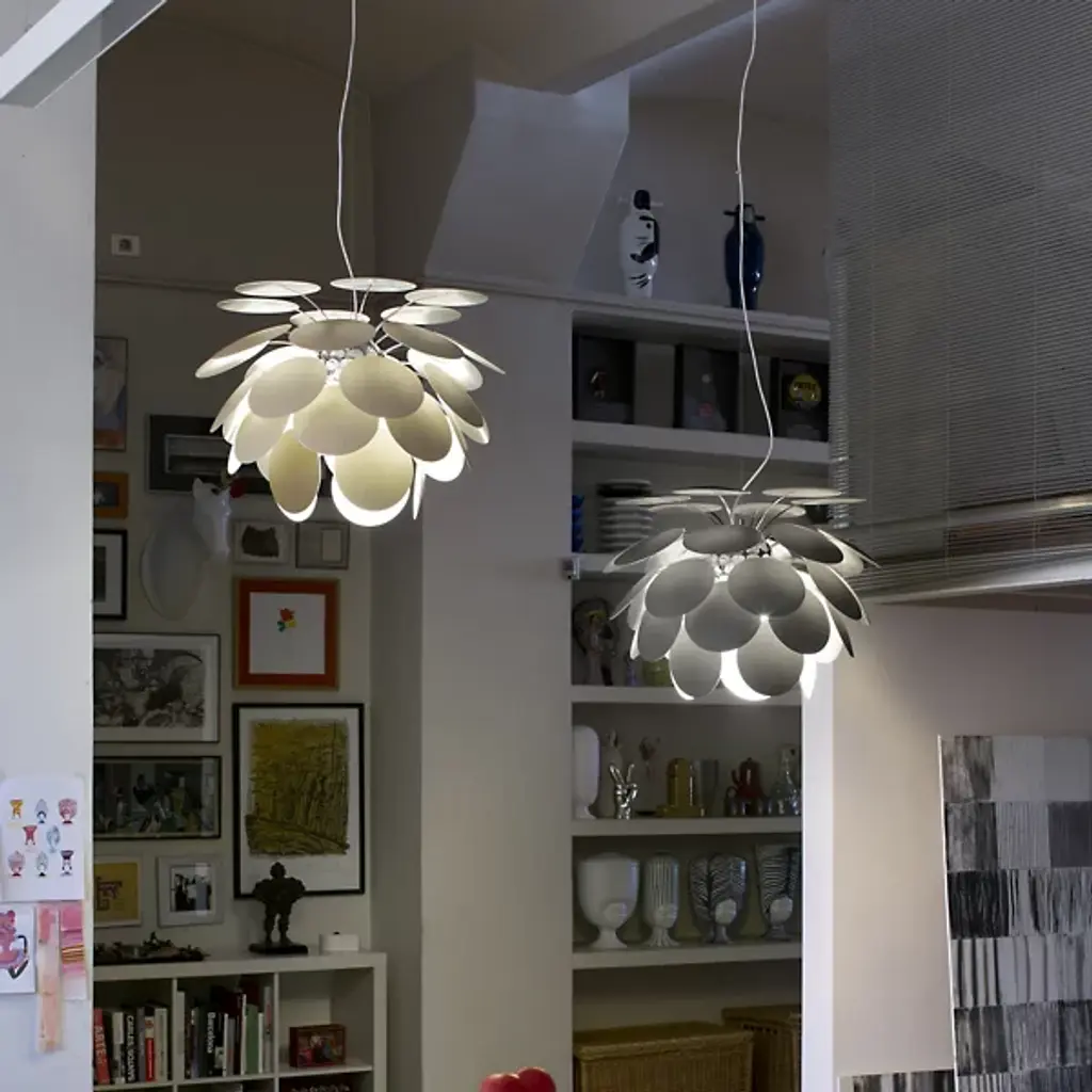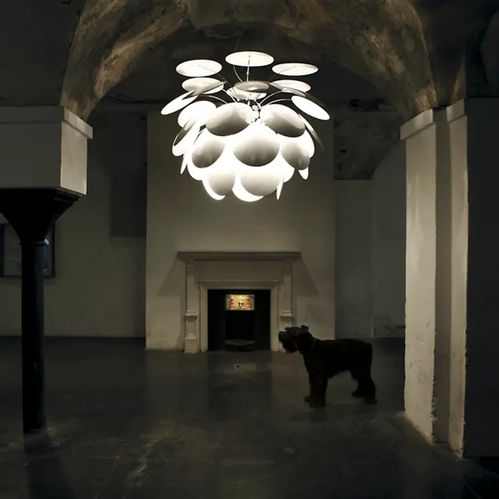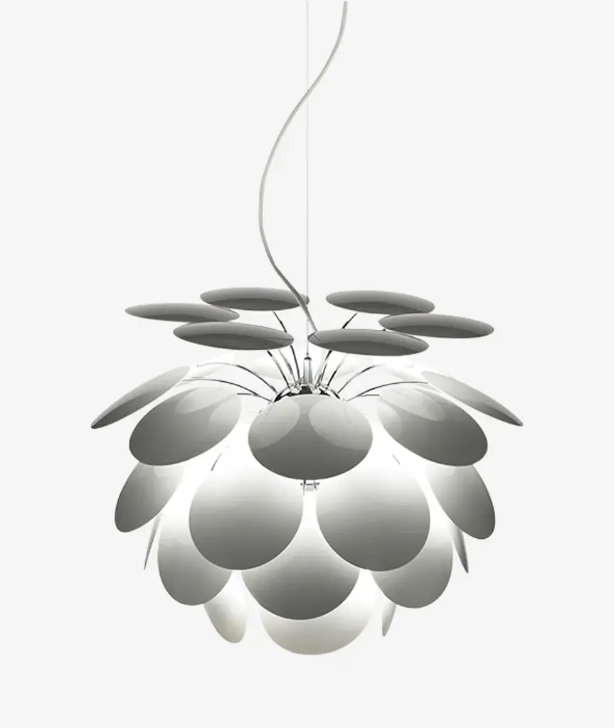 Designed by Christophe Mathieu, the Marset Discoco Pendant consists of a series of lacquered discs that float around a chromed semi-sphere. The discs act as layers that shield the light source while at the same time redirecting and reflecting the light onto the underlying discs. The result is a distinct and unique light which fills and enriches any space.