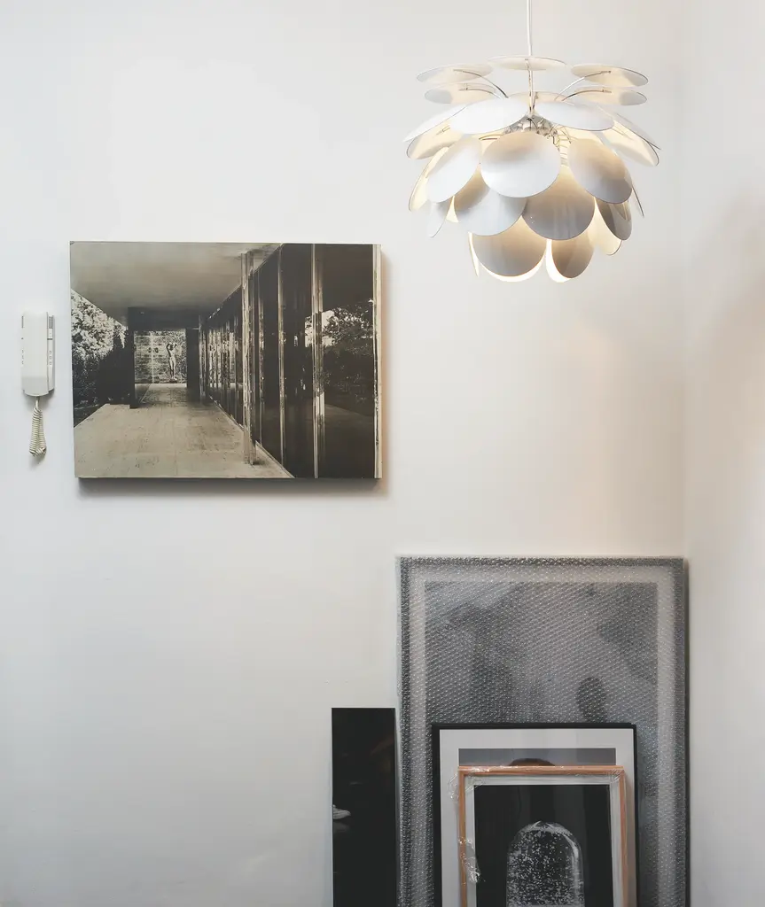 Exuberant even when turned off, the richness of the light issuing from the Discocó lamp provides direct downward illumination along with a dramatic play of lights and soft shadows. Its detailed study of incident light and light that bounces off of both sides of the 35 disks provide the lamp with an appealing gradation of light nuances and depth. Further reflections dance off the chrome-covered sphere at the core, where the disks are anchored. When the light is turned off, it retains its attractive presence, hinting at the expansion of energy that is fully expressed when it is turned on.