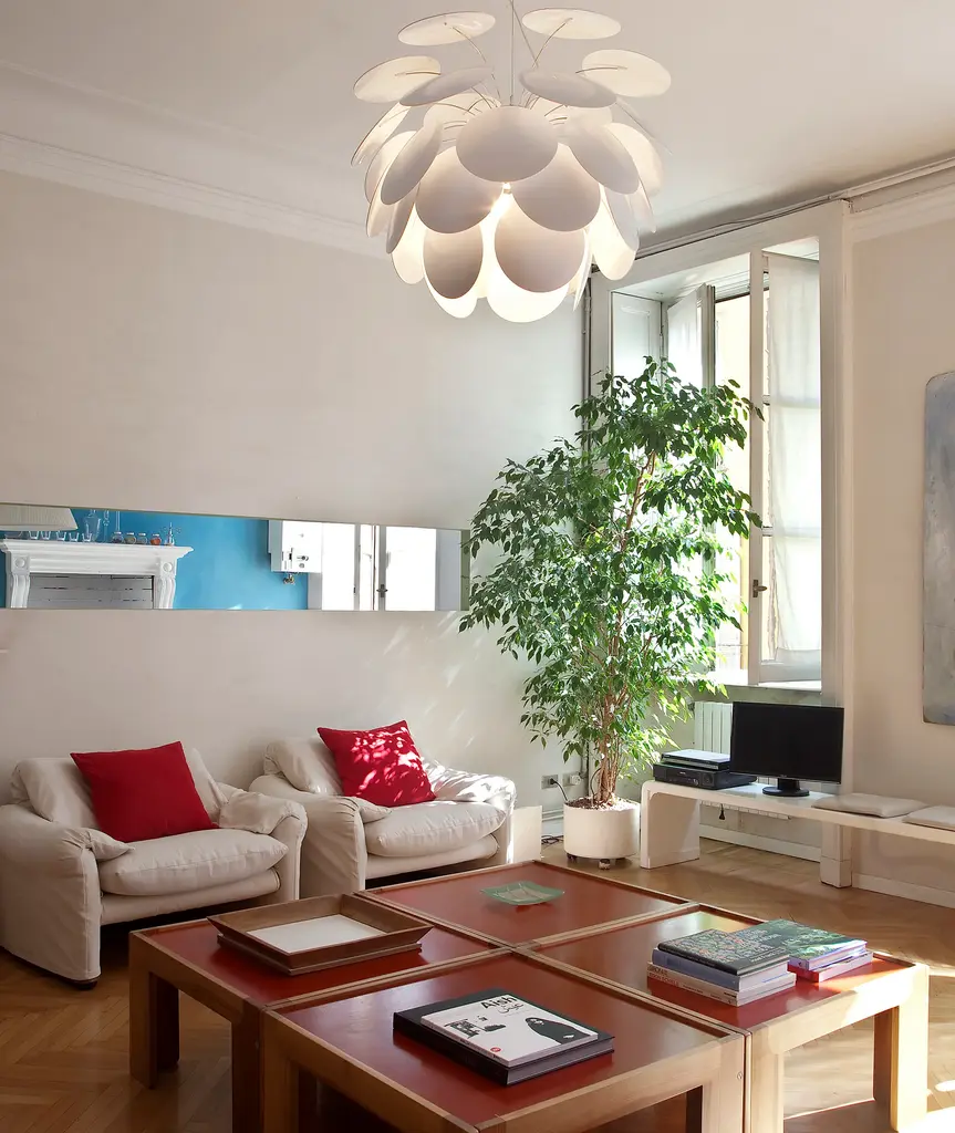 Exuberant even when turned off, the richness of the light issuing from the Discocó lamp provides direct downward illumination along with a dramatic play of lights and soft shadows. Its detailed study of incident light and light that bounces off of both sides of the 35 disks provide the lamp with an appealing gradation of light nuances and depth. Further reflections dance off the chrome-covered sphere at the core, where the disks are anchored. When the light is turned off, it retains its attractive presence, hinting at the expansion of energy that is fully expressed when it is turned on.