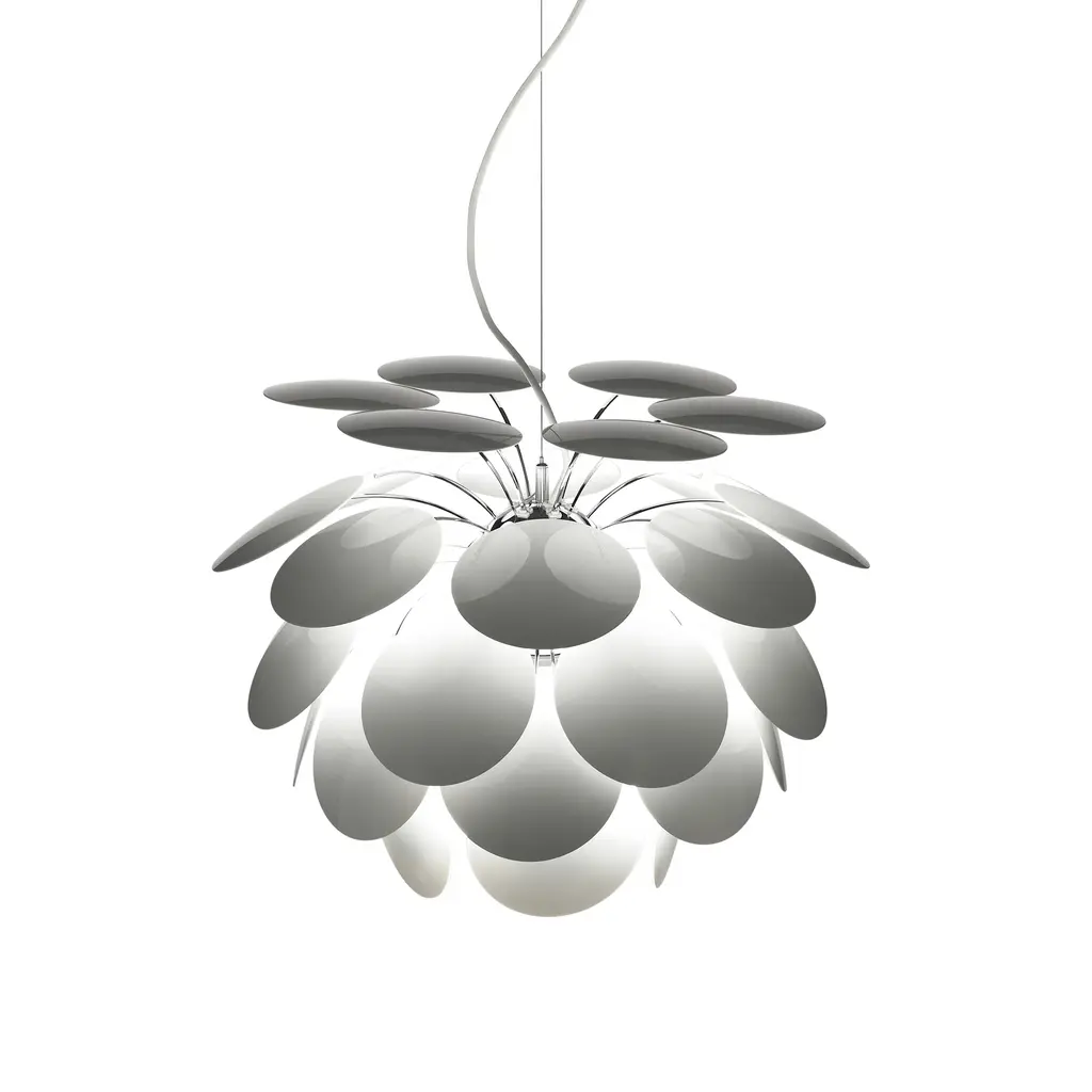 Exuberant even when turned off, the richness of the light issuing from the Discocó lamp provides direct downward illumination along with a dramatic play of lights and soft shadows. Its detailed study of incident light and light that bounces off of both sides of the 35 disks provide the lamp with an appealing gradation of light nuances and depth. Further reflections dance off the chrome-covered sphere at the core, where the disks are anchored. When the light is turned off, it retains its attractive presence, hinting at the expansion of energy that is fully expressed when it is turned on.