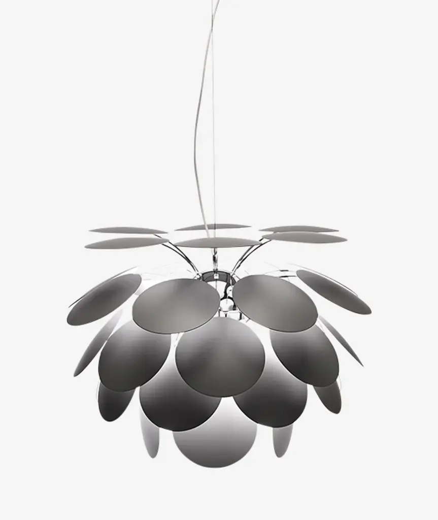 Exuberant even when turned off, the richness of the light issuing from the Discocó lamp provides direct downward illumination along with a dramatic play of lights and soft shadows. Its detailed study of incident light and light that bounces off of both sides of the 35 disks provide the lamp with an appealing gradation of light nuances and depth. Further reflections dance off the chrome-covered sphere at the core, where the disks are anchored. When the light is turned off, it retains its attractive presence, hinting at the expansion of energy that is fully expressed when it is turned on.