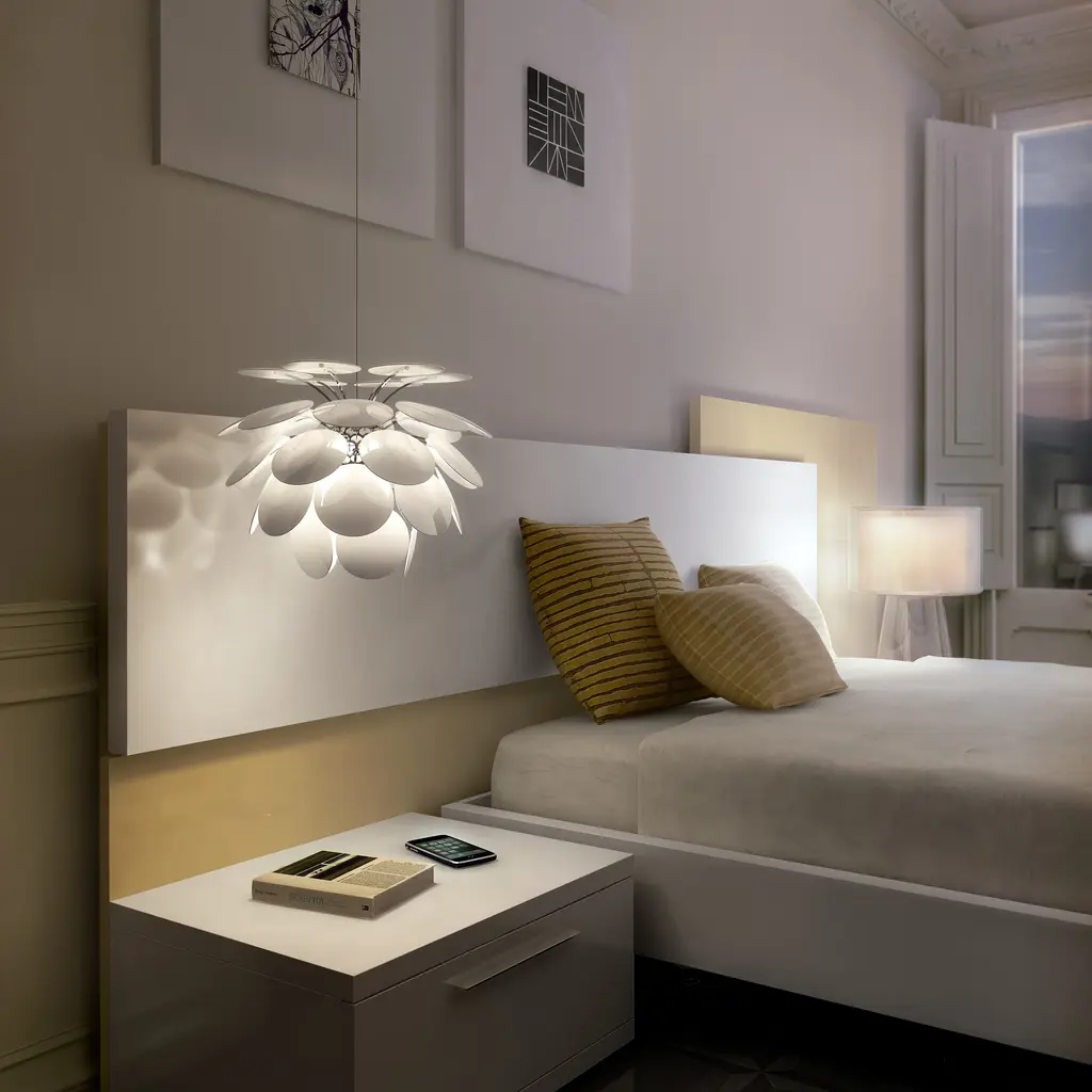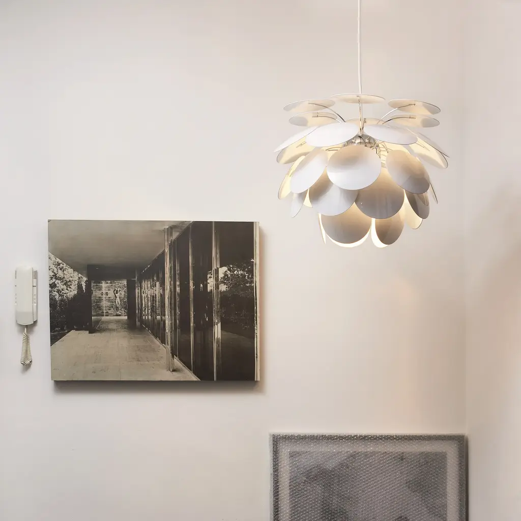 The Marset Discoco Pendant is a stunning light fixture that will add exquisite elegance to any space. Crafted with a chromed semi-sphere, each lacquered disc encircles and refracts the light, giving any room a unique and artistic atmosphere. Transform your living area with this eye-catching statement design. Highlights