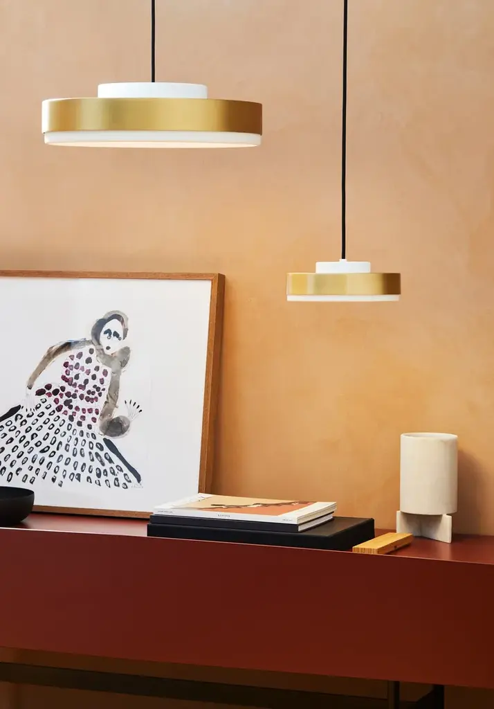 Discus is a LED dimmable brass pendant lamp.Light source:Small1 x Custom LED 12.5 W2100 Lm nominal3000 °K; CRI>80IP20DimmableLarge1 x Custom LED 31.5 W3800 Lm nominal3000 °K; CRI>80IP20Dimmable