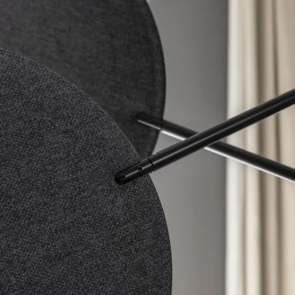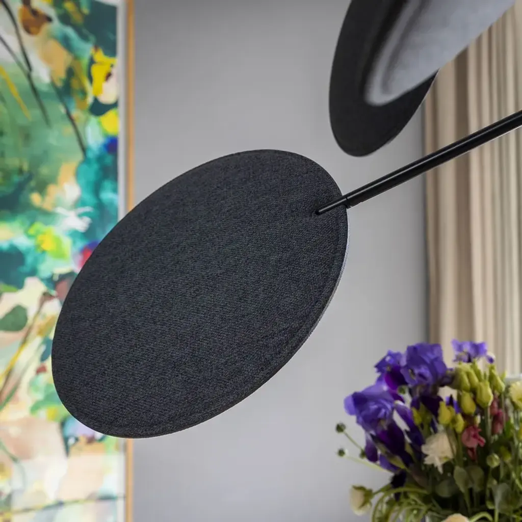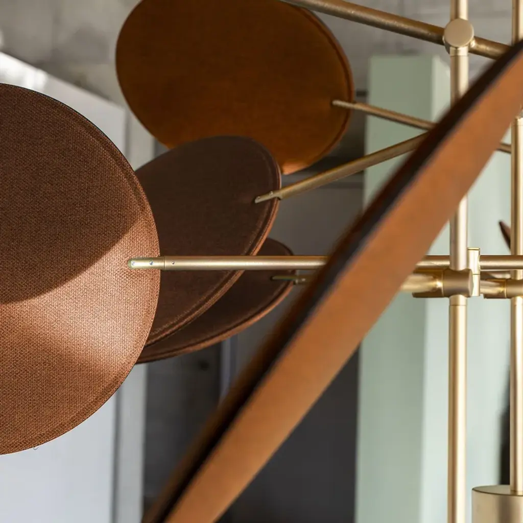 Diva is a pendant lamp with a metal structure featuring adjustable arms that hold movable discs. Available in painted black or brass finish. The adjustable discs have sound-absorbing properties and are upholstered in melange fabrics, available in the following colors from the sample range: anthracite, beige, purple, brick, teal, and green. The lamp includes 3 light sources and 12 sound-absorbing discs.