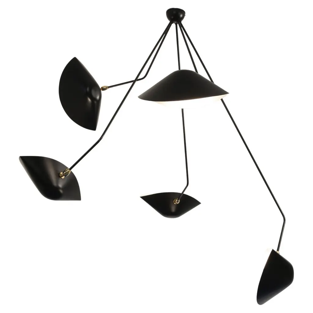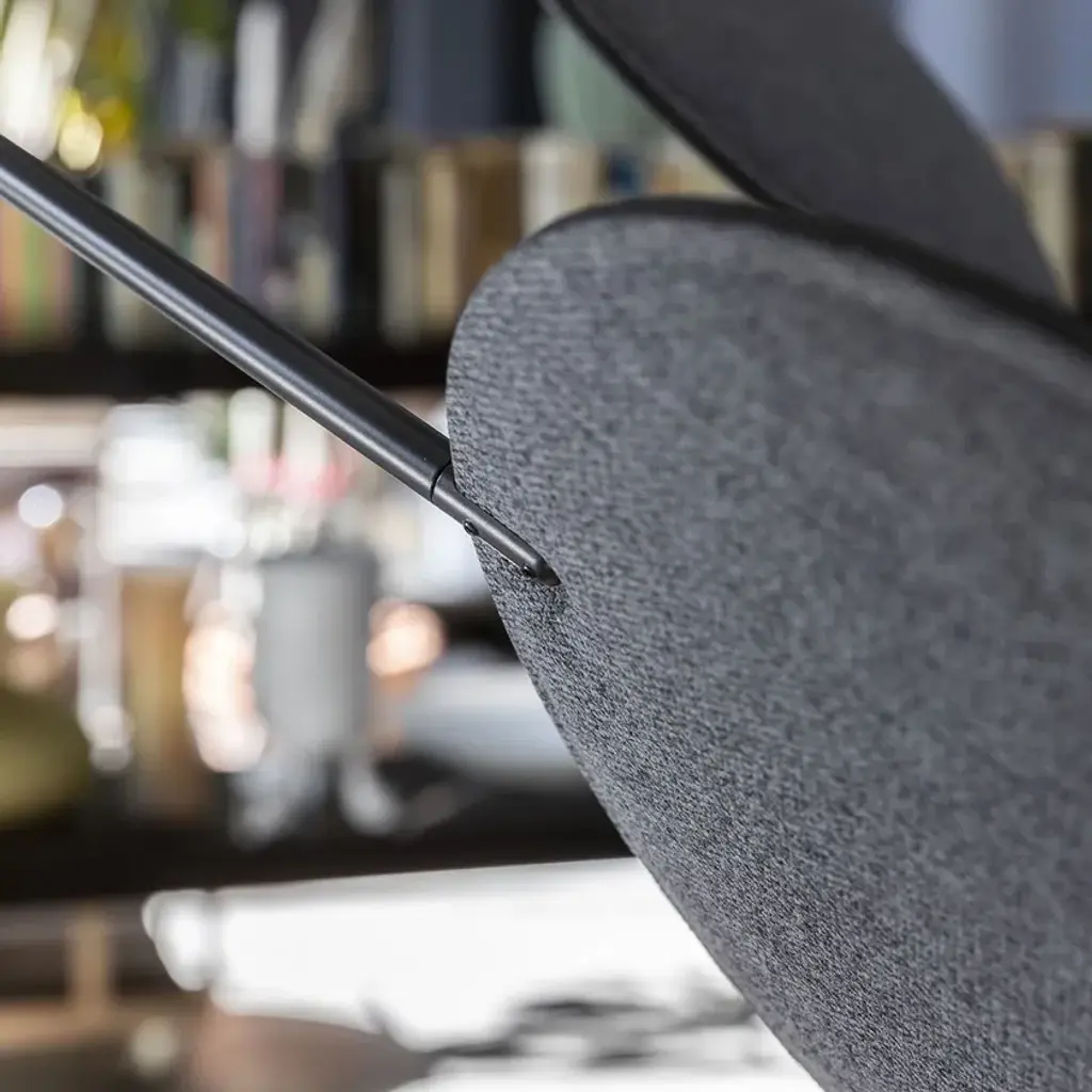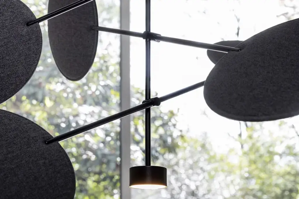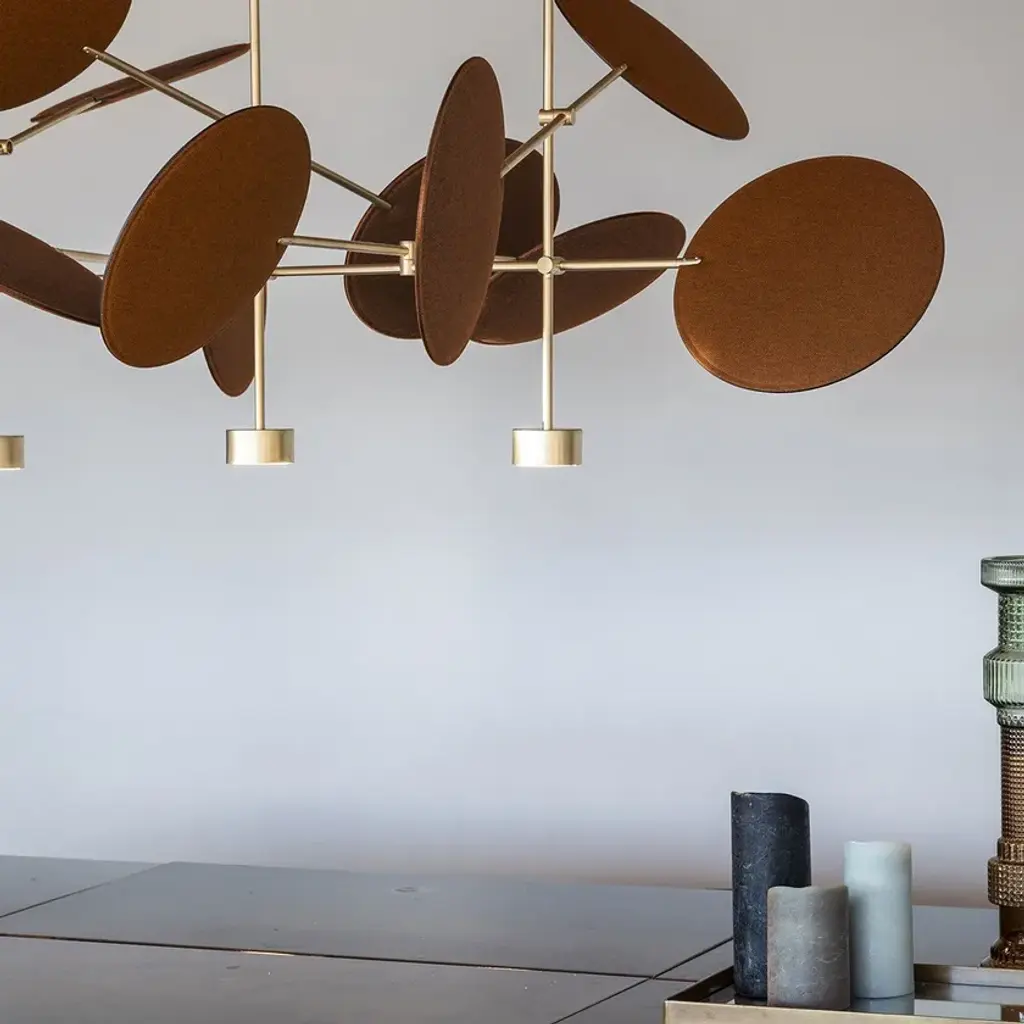 Diva is a pendant lamp with a metal structure featuring adjustable arms that hold movable discs. Available in painted black or brass finish. The adjustable discs have sound-absorbing properties and are upholstered in melange fabrics, available in the following colors from the sample range: anthracite, beige, purple, brick, teal, and green. The lamp includes 3 light sources and 12 sound-absorbing discs.