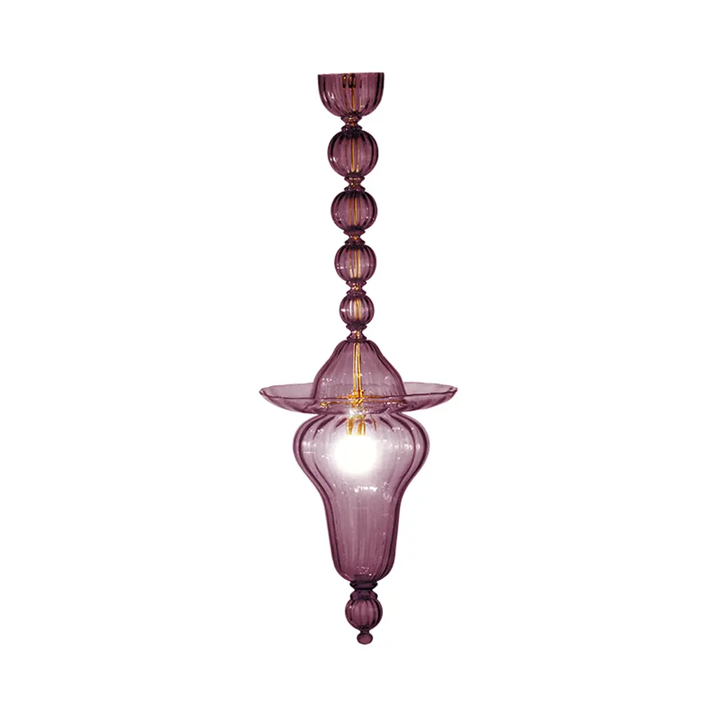 Indulge in the timeless beauty of the Doge Pendant Light from Venini. Inspired by the elaborate cesendello oil lamps of Renaissance era Venice, this pendant collection originally crafted by Napoleone Martinuzzi in 1927 exudes a delicate balance of classic and modern design. Use to bring dynamic luxury to a kitchen island countertop, or pair in multiples at varying heights for a custom dining room centerpiece. Highlights