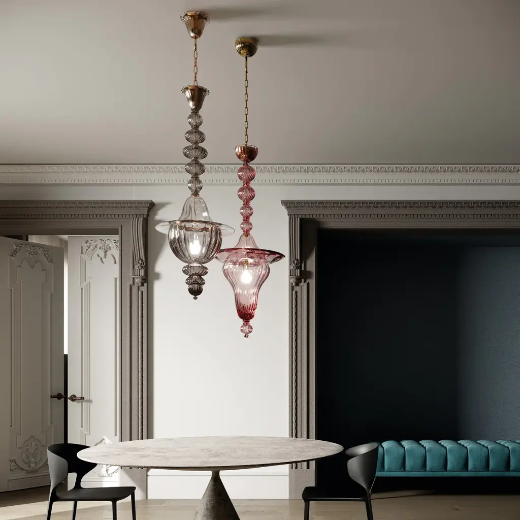 Indulge in the timeless beauty of the Doge Pendant Light from Venini. Inspired by the elaborate cesendello oil lamps of Renaissance era Venice, this pendant collection originally crafted by Napoleone Martinuzzi in 1927 exudes a delicate balance of classic and modern design. Use to bring dynamic luxury to a kitchen island countertop, or pair in multiples at varying heights for a custom dining room centerpiece. Highlights
