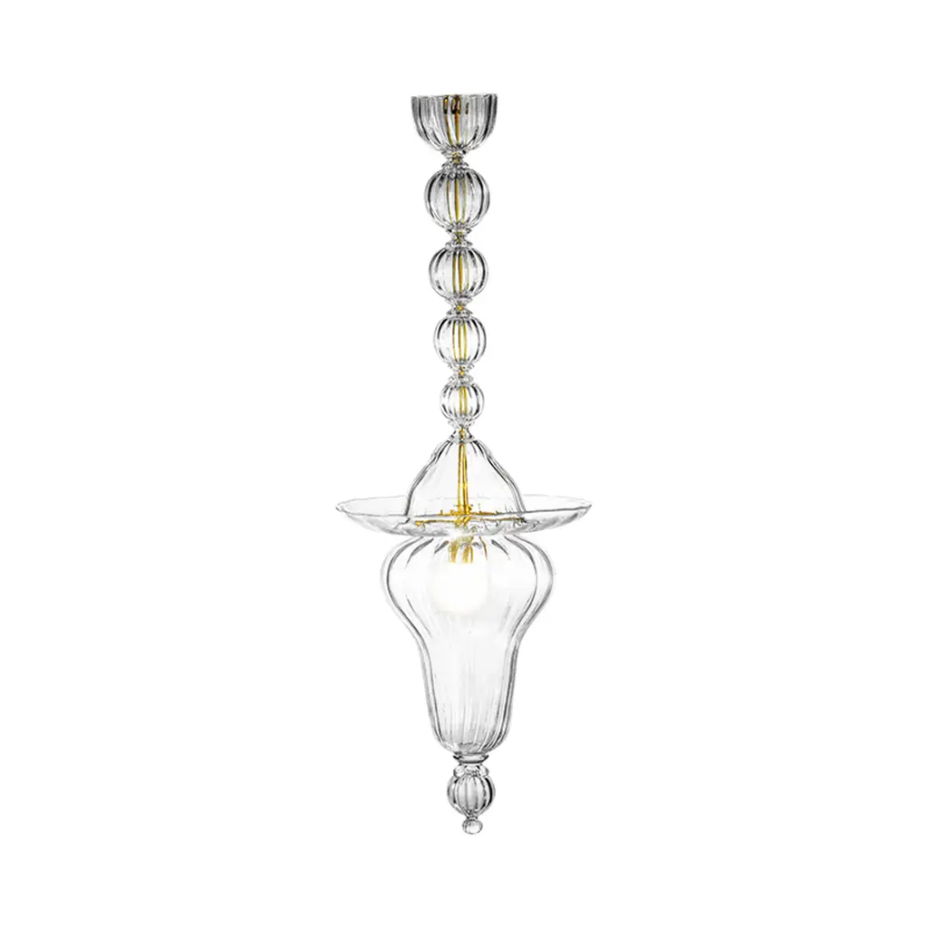 Indulge in the timeless beauty of the Doge Pendant Light from Venini. Inspired by the elaborate cesendello oil lamps of Renaissance era Venice, this pendant collection originally crafted by Napoleone Martinuzzi in 1927 exudes a delicate balance of classic and modern design. Use to bring dynamic luxury to a kitchen island countertop, or pair in multiples at varying heights for a custom dining room centerpiece. Highlights
