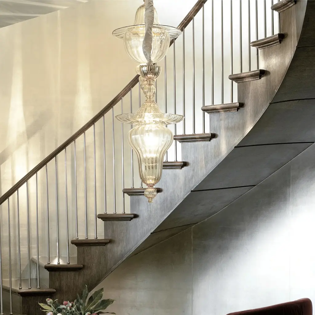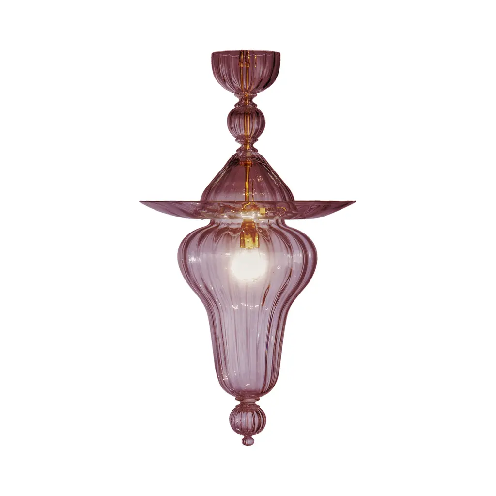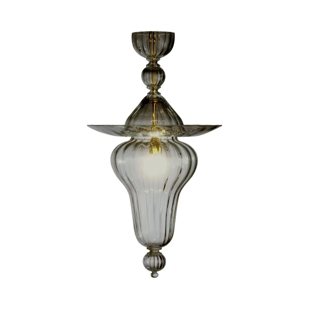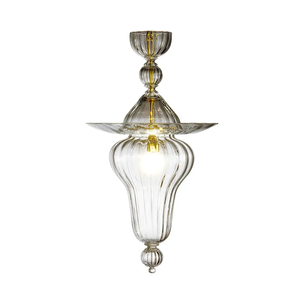 Indulge in the timeless beauty of the Doge Pendant Light from Venini. Inspired by the elaborate cesendello oil lamps of Renaissance era Venice, this pendant collection originally crafted by Napoleone Martinuzzi in 1927 exudes a delicate balance of classic and modern design. Use to bring dynamic luxury to a kitchen island countertop, or pair in multiples at varying heights for a custom dining room centerpiece. Highlights