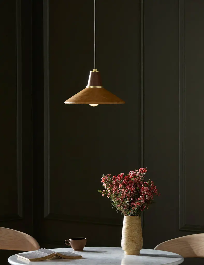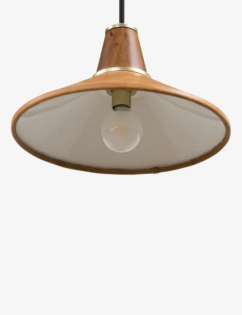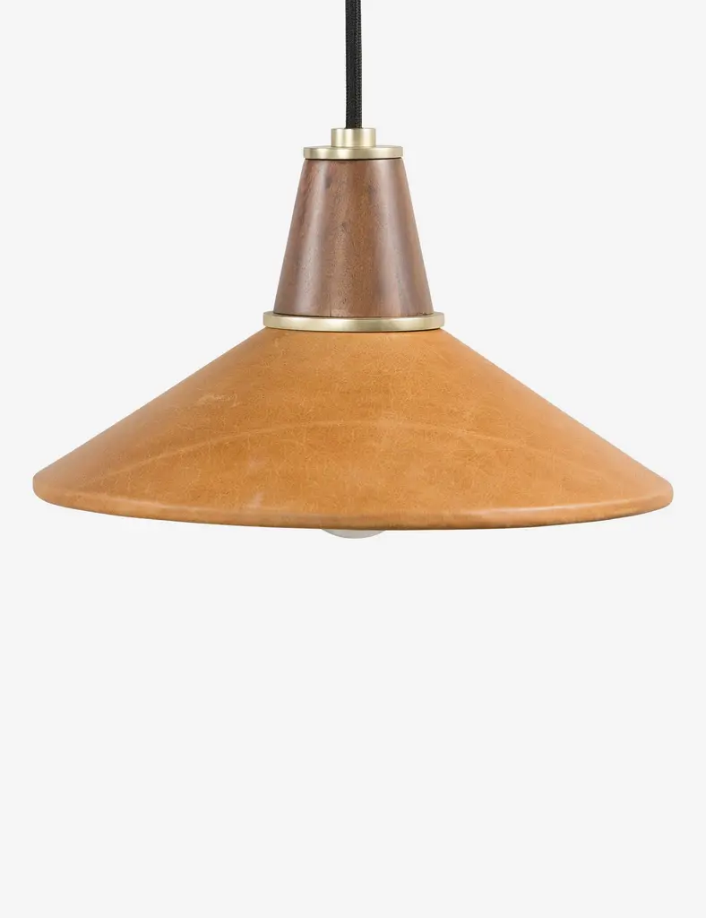 Top-grain leather, solid walnut, and metal accents bring beautiful mixed materiality to bear in this mid-century-inspired lighting collection. The Doherty pendant light features a sleek, classic silhouette that can style as a single hanging light fixture or in multiples for an eye-catching overhead feature.