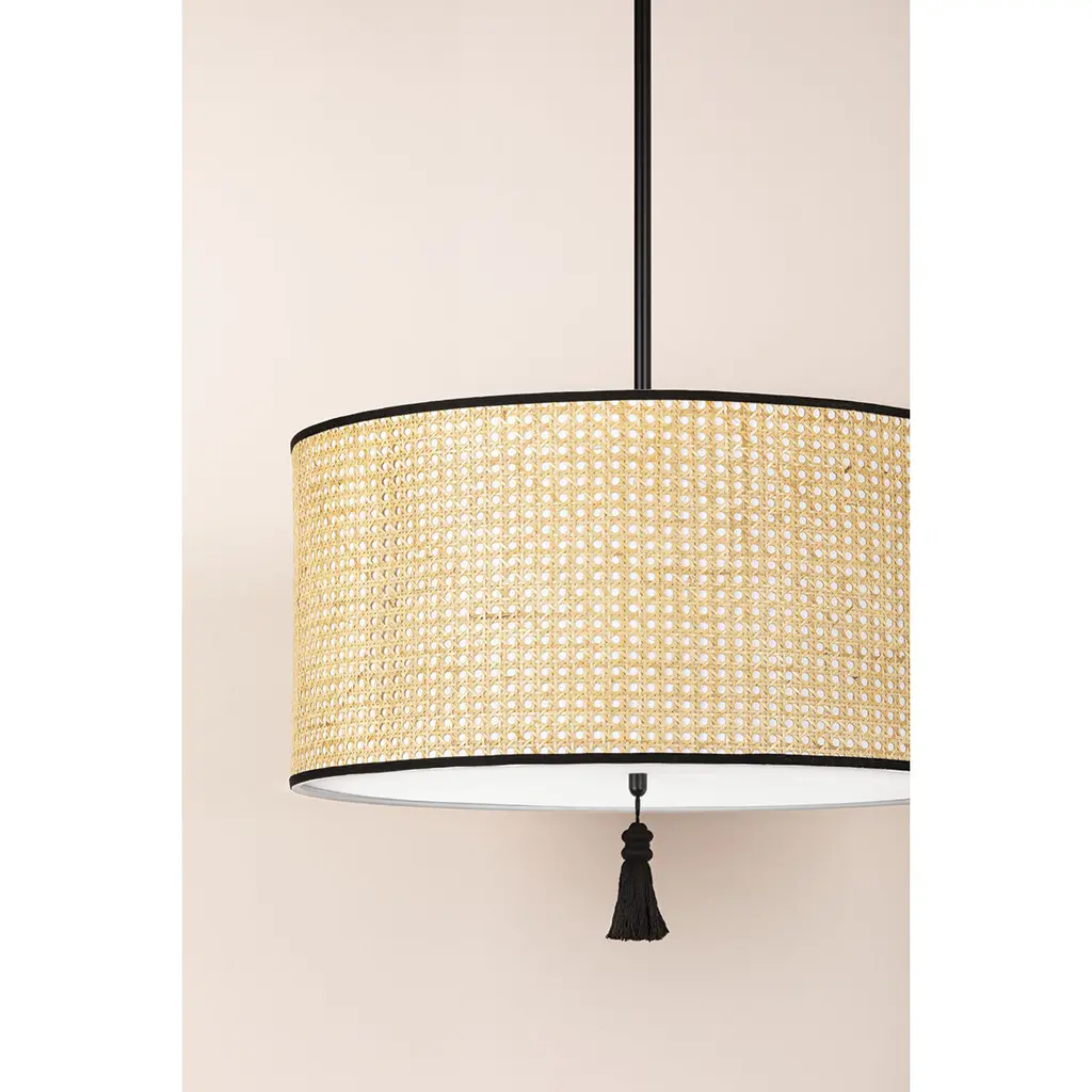 A bohemian darling, Dolores is brimming with theatrical flair. Dolores pays homage to the cane mania of the 70s, reinvented for today. Natural cane is woven intricately around a white cotton shade, contrasted with a soft black finish. The flush mount and pendant versions feature a decorative tassel for good measure.