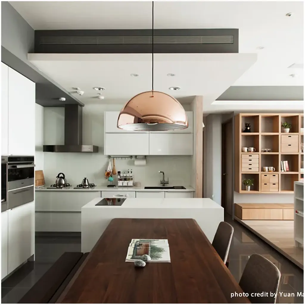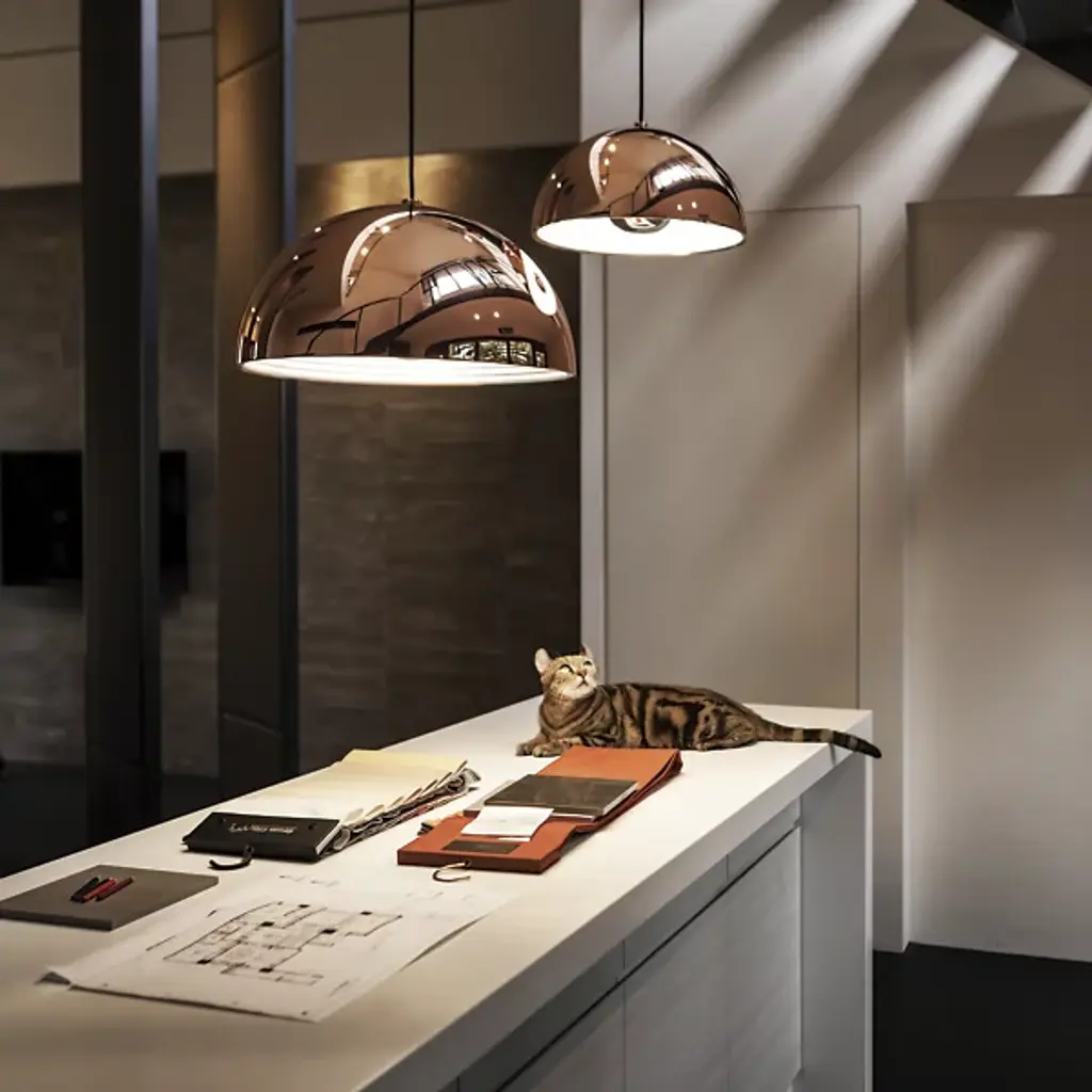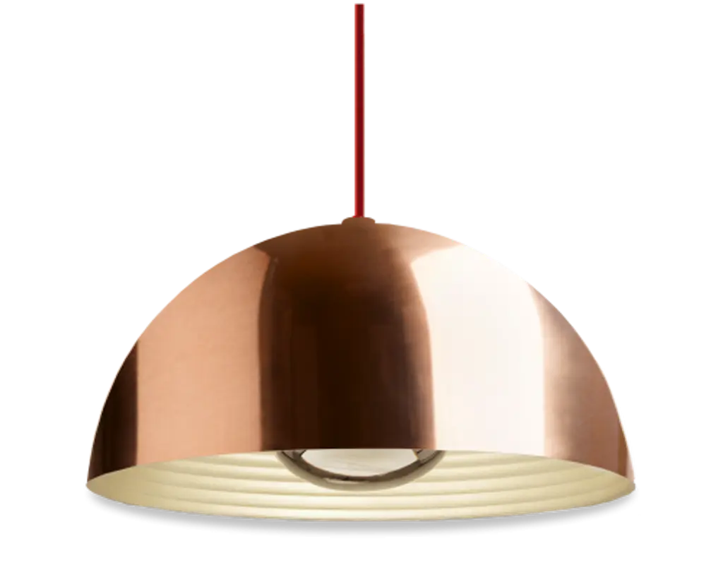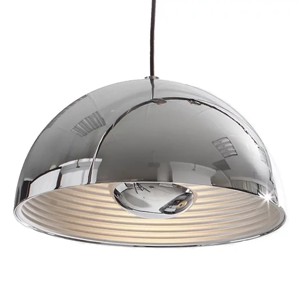 The Seed Design Dome Pendant pairs impressive craftsmanship with a bold size and clean lines. Futuristic and retro at the same time, the oversized shade has a centric-circled aluminum reflector and bulb cover, to keep the lamp out of site and prevent glaring. Great in pairs, groups or alone, this minimalist pendant speaks for itself through its high quality and sheen.