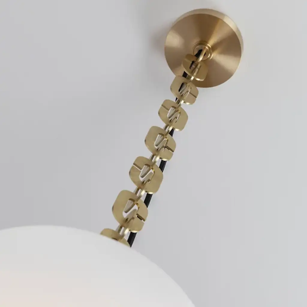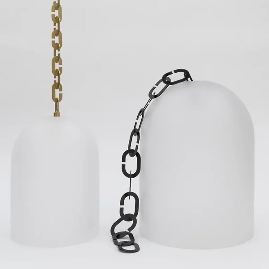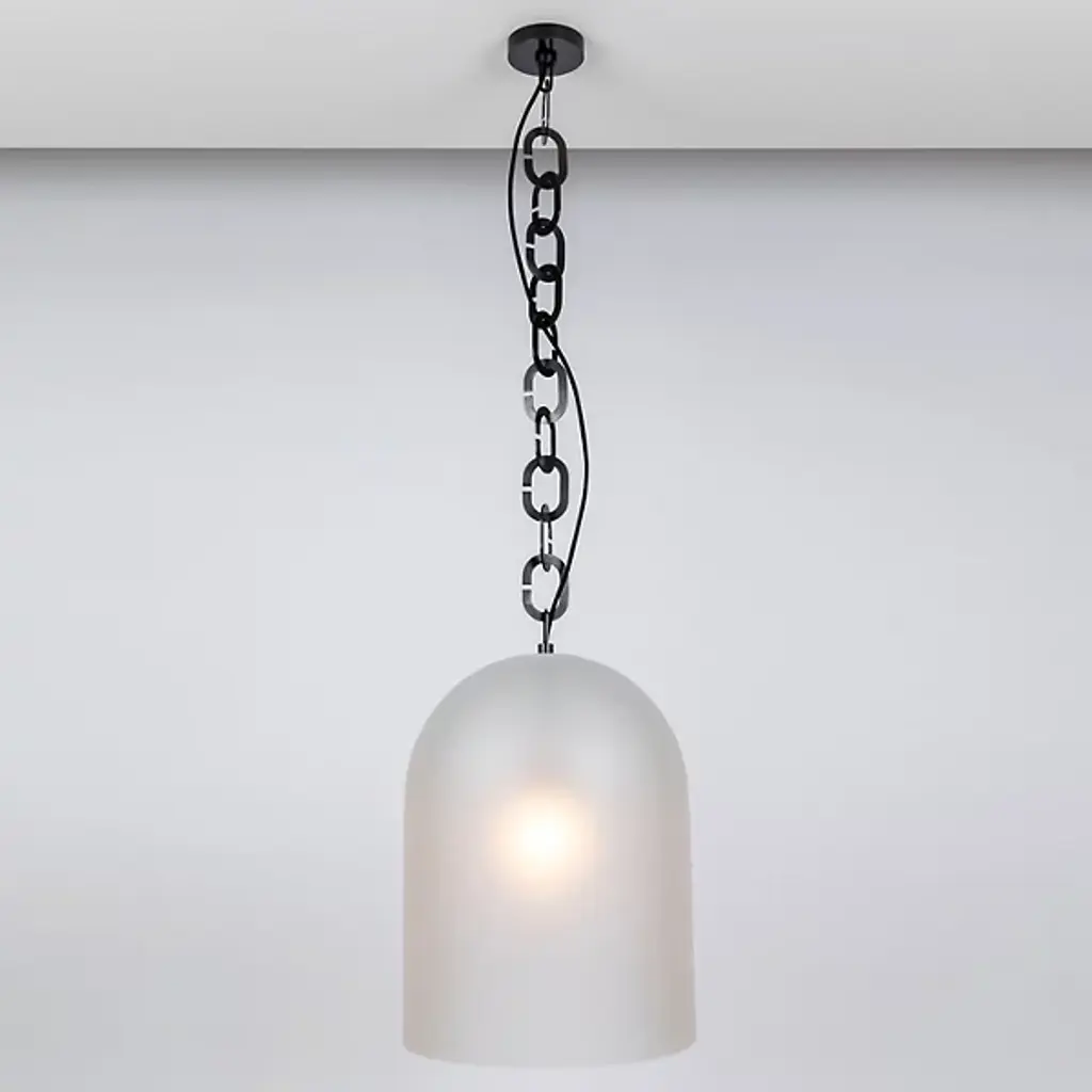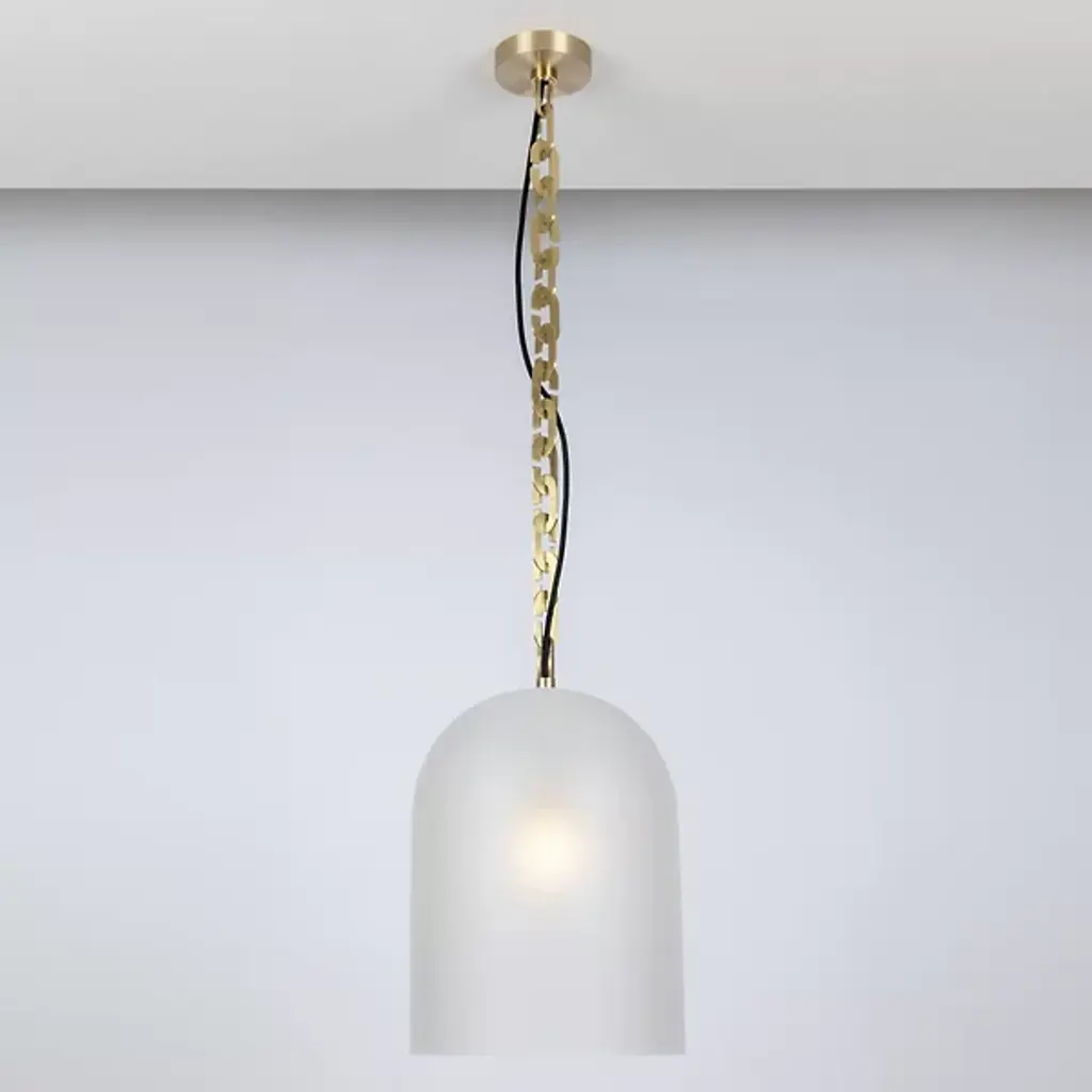 Add artisanal modern appeal to inside ceilings with the Dome Pendant from SkLO. Elegant and airy, the fixture starts with a series of large brass chain links traveling downward from a circular canopy, placing potent lamping beneath a tall, broad dome shade of handblown Czech glass. The chain itself offers ample room for the single slender power cord that travels down through the links, providing structural strength and sculptural intrigue that contrasts with the vibrant, unique surface of the translucent glass shade that they support.