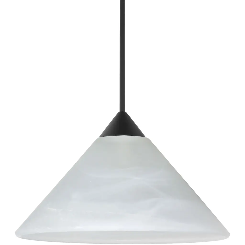 Domi has a classical bell shape that complements aesthetic, while also built for optimal illumination. Our Marble glass is a pressed glass that features swirls of white throughout semi-translucent frost, to create a faux alabaster appearance. When lit this gives off a light that is functional and soothing. The smooth satin finish on the clear outer layer is a result of an extensive etching process. This handcrafted glass uses a process where every glass is consistently produced using a press mold, keeping variations to a minimum. The 12V cord pendant fixture is equipped with a 10' braided coaxial cord with teflon jacket and a low profile flat monopoint canopy. These stylish and functional luminaries are offered in a beautiful Black finish.