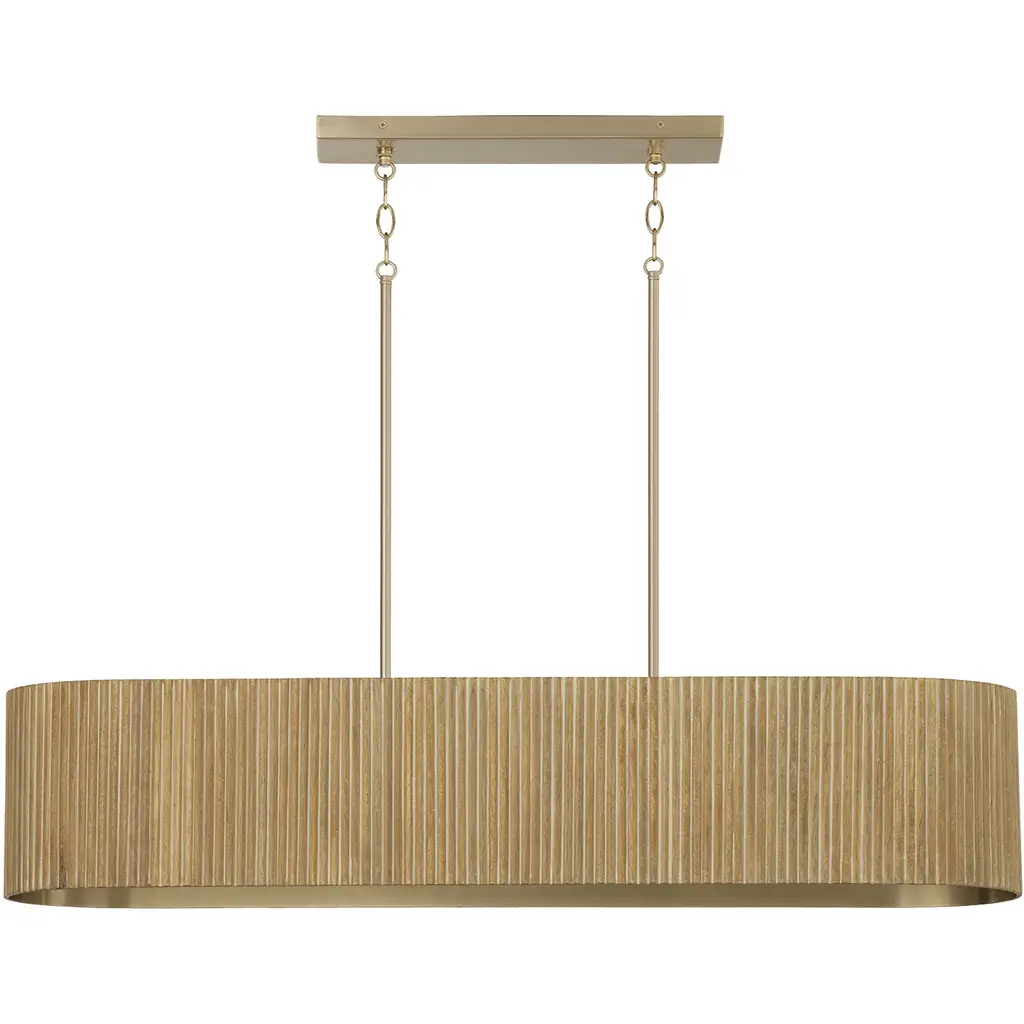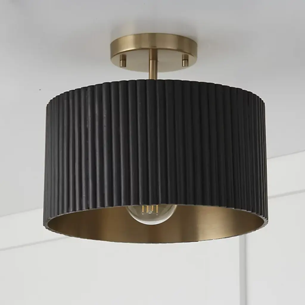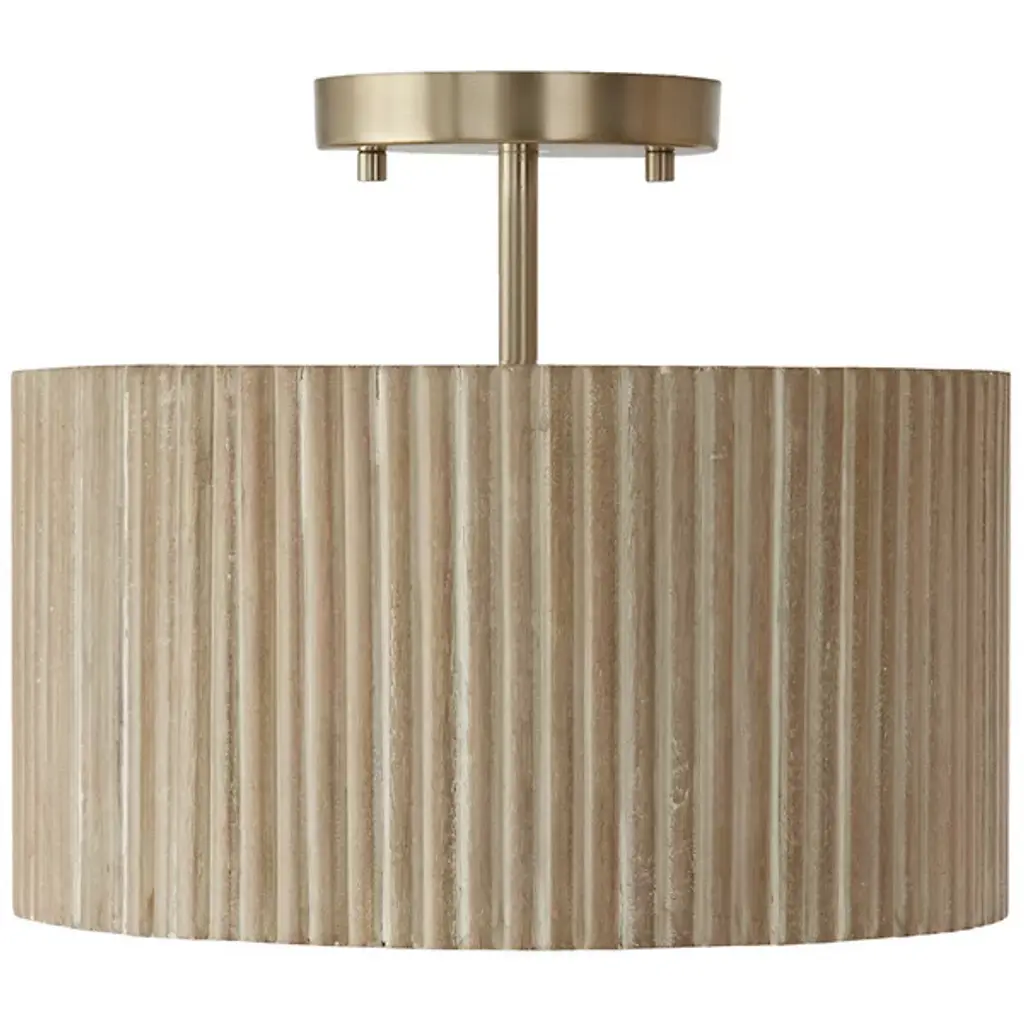 The Donovan Semi-Flushmount from Capital Lighting bridges gaps between artisanal modern and transitional styles. Crafted with meticulous attention to detail, the drum-shaped framework of this semi-flushmount features a distinctive ribbed appearance. Handcrafted from mango wood, this piece is distinctive, showcasing natural variation that adds character and charm. Designed for versatility, Donovan boasts a convertible dual mount feature. Metal complements a fluted mango wood shade, creating a harmonious balance. It is illuminated by a vibrant LED.