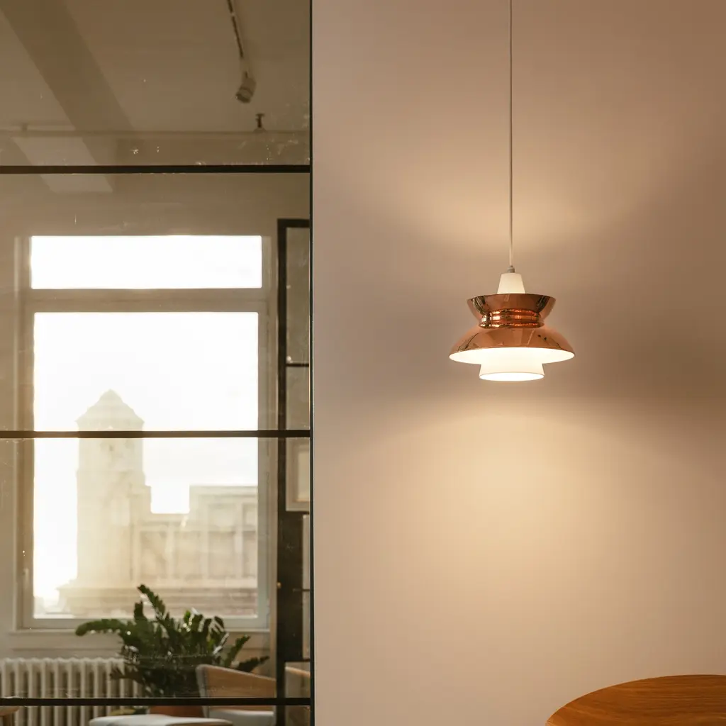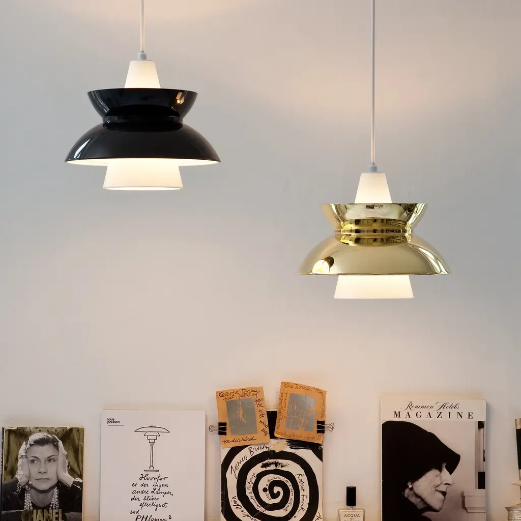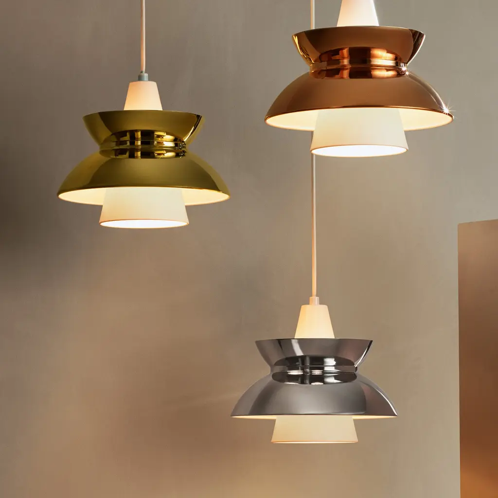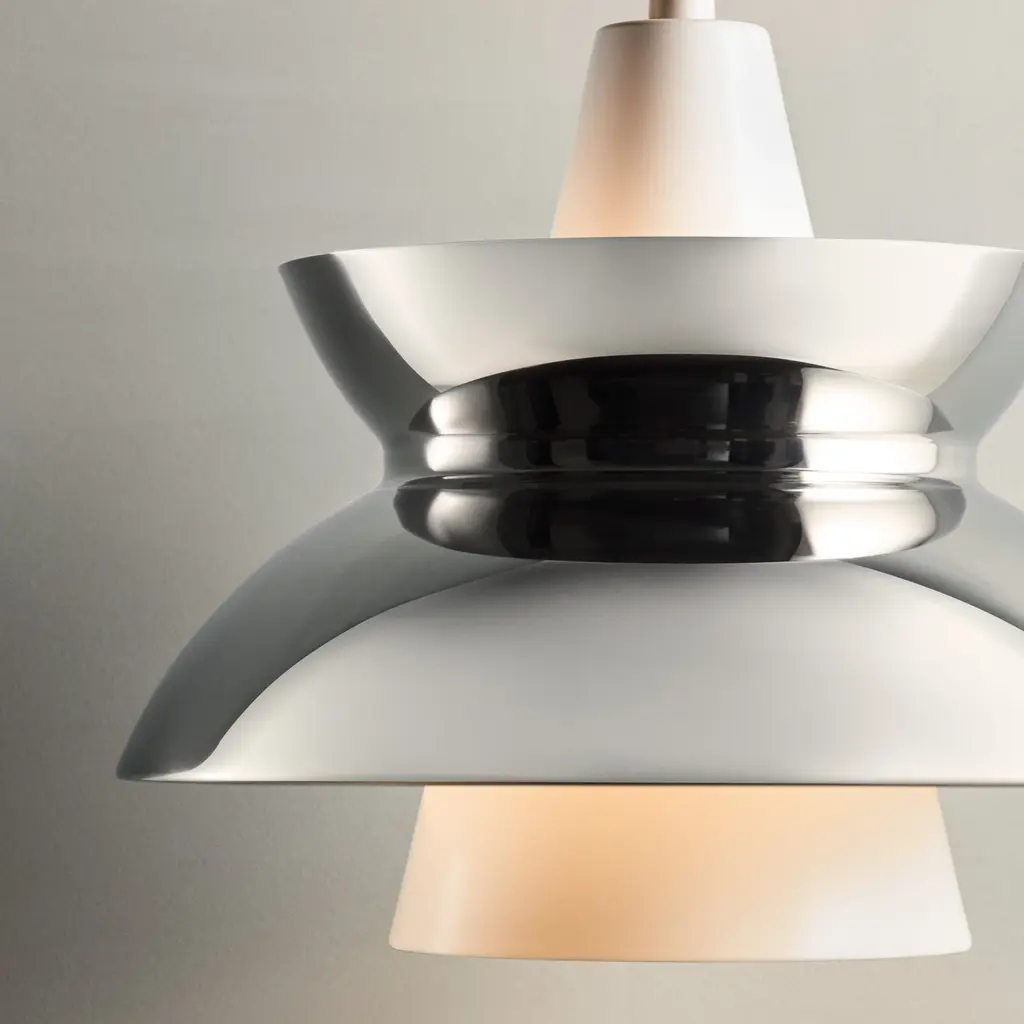 The Doo-Wop Pendant by Louis Poulsen, originally designed in the 1950s in collaboration with the Danish Navy Buildings Department, was widely used in naval canteens and offices due to its functional and versatile lighting properties. It was reintroduced in 2012 with updated colors and a brass version. The pendant is handcrafted using a spinning technique, with its distinctive inner and outer shades providing both direct downward and soft, diffused light. Available in various finishes, including brass, copper, stainless steel, and painted versions, it blends retro charm with modern aesthetics, making it a popular choice for both residential and commercial spaces.