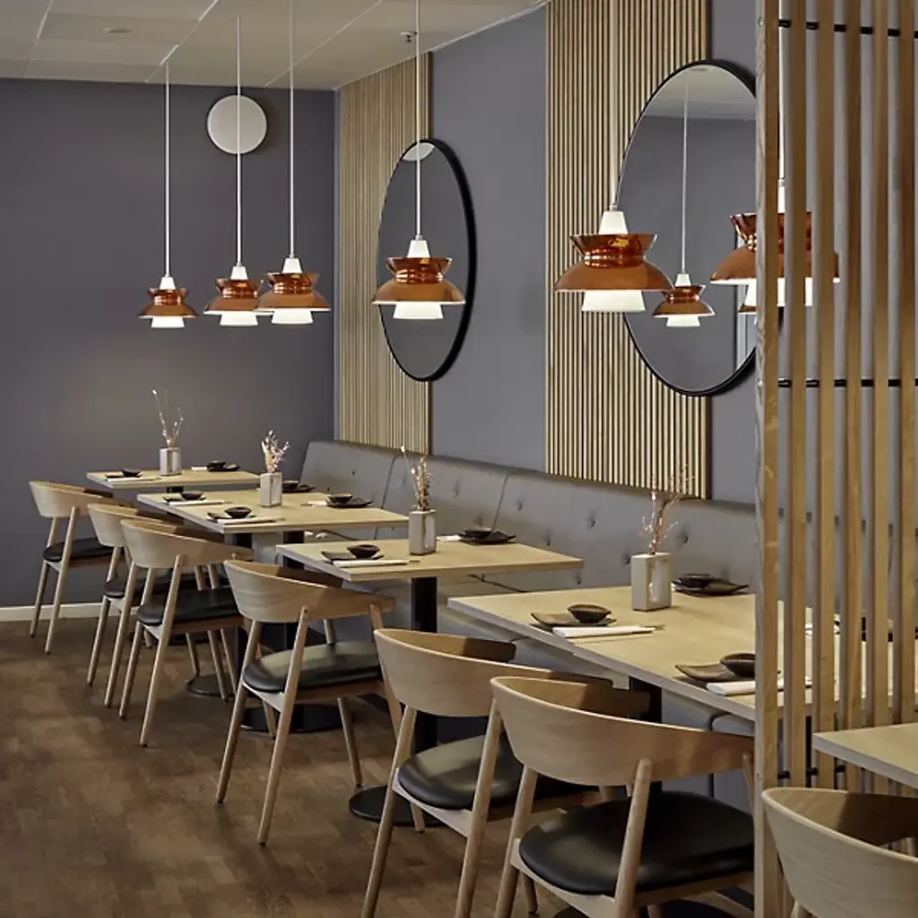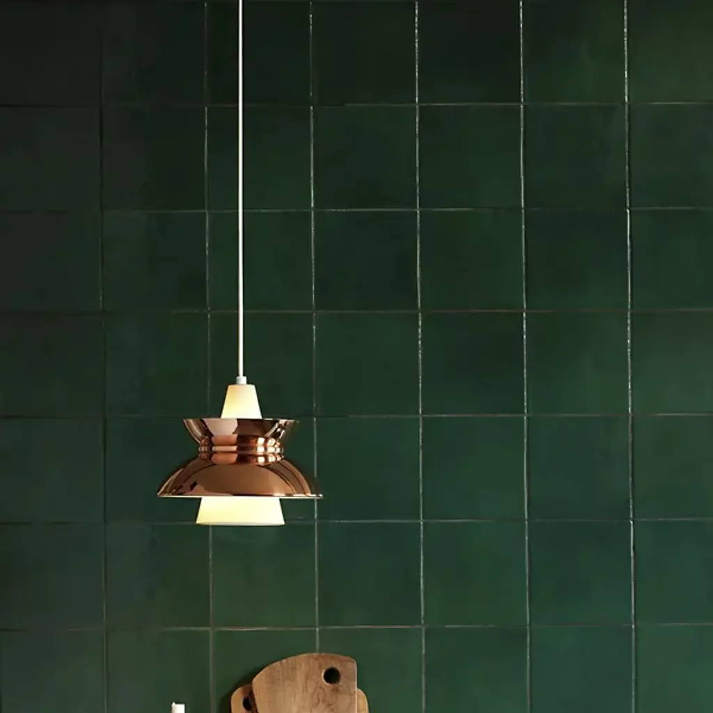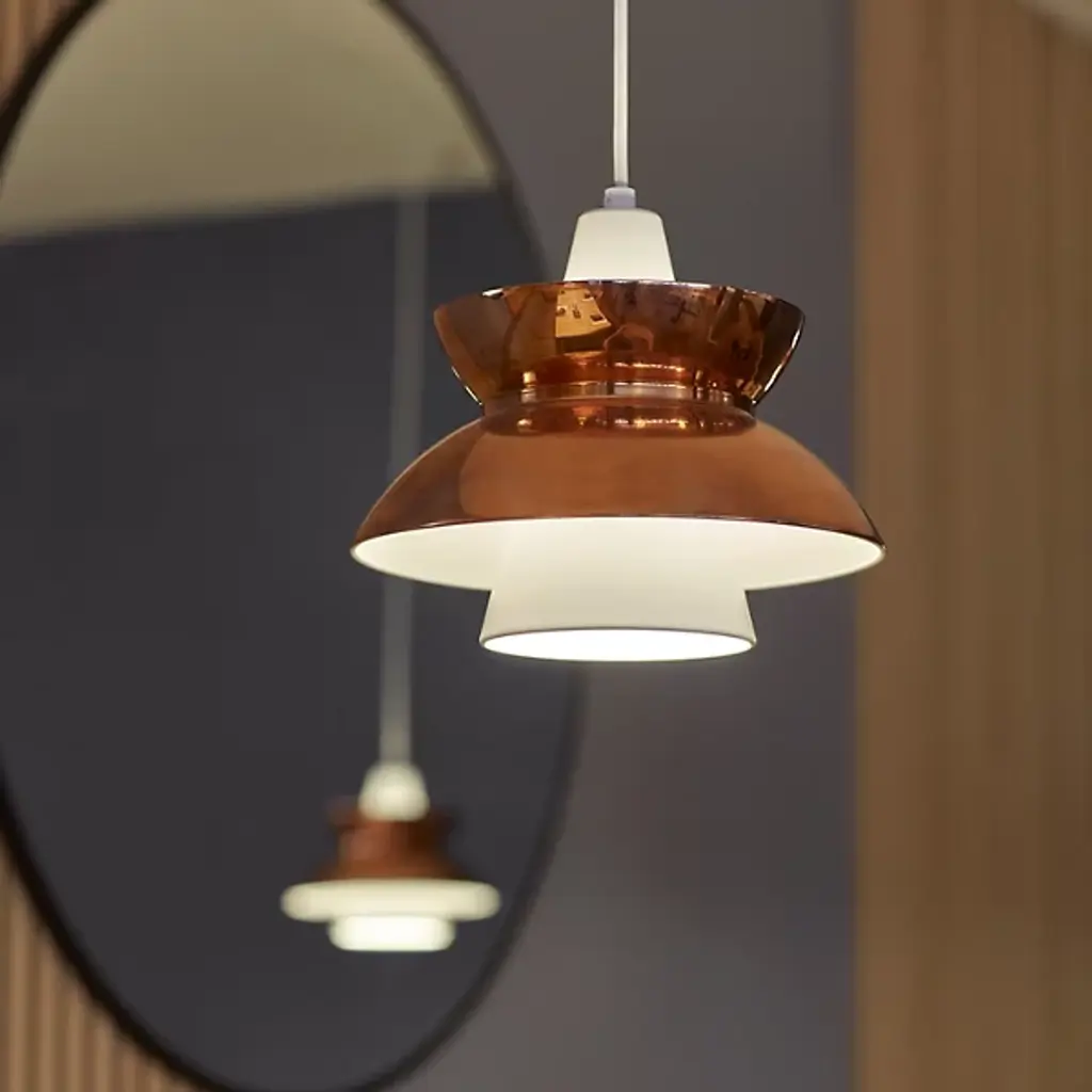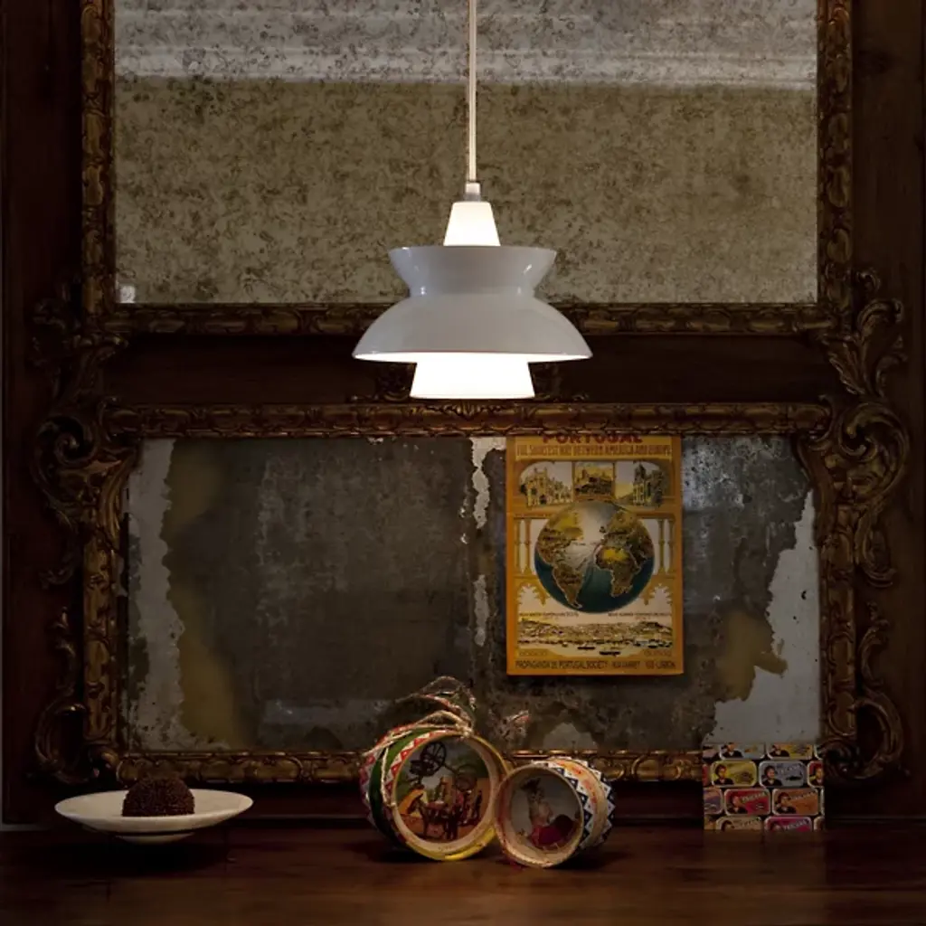 Designed with help from the Navy Buildings Department, the Doo-Wop Pendant by Louis Poulsen is perfectly styled to fit in any room as a statement piece. With a variety of metallic finishes and a white canopy, the pendants work well in a dining room or in a living room. The bulb is placed in such a way that it provides a downward directed soft light. This pendant features hand-spun brass. Its rolled edge gives the piece optical volume. It is distinguished by its inner shade.