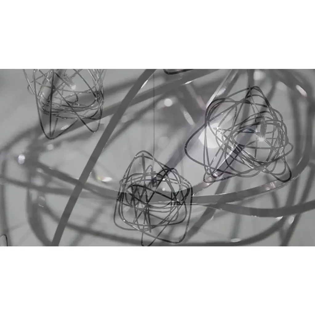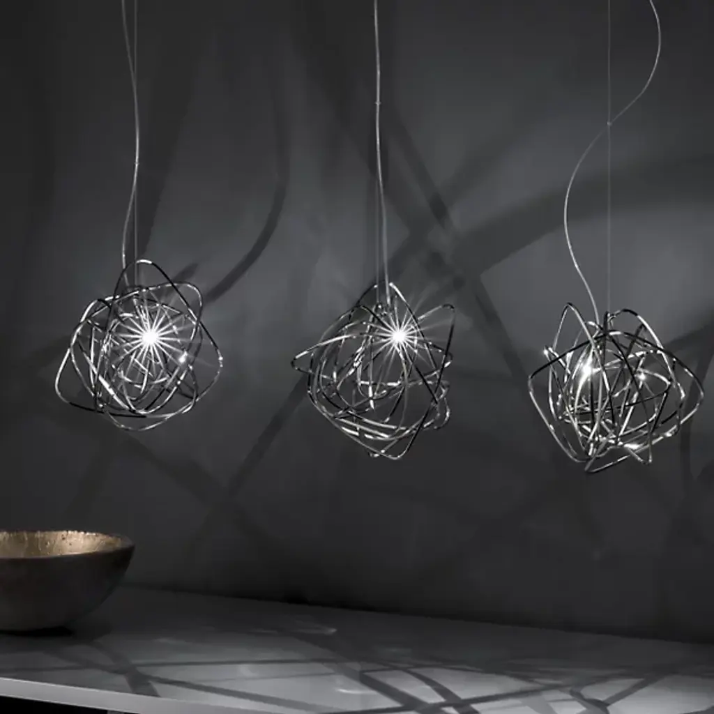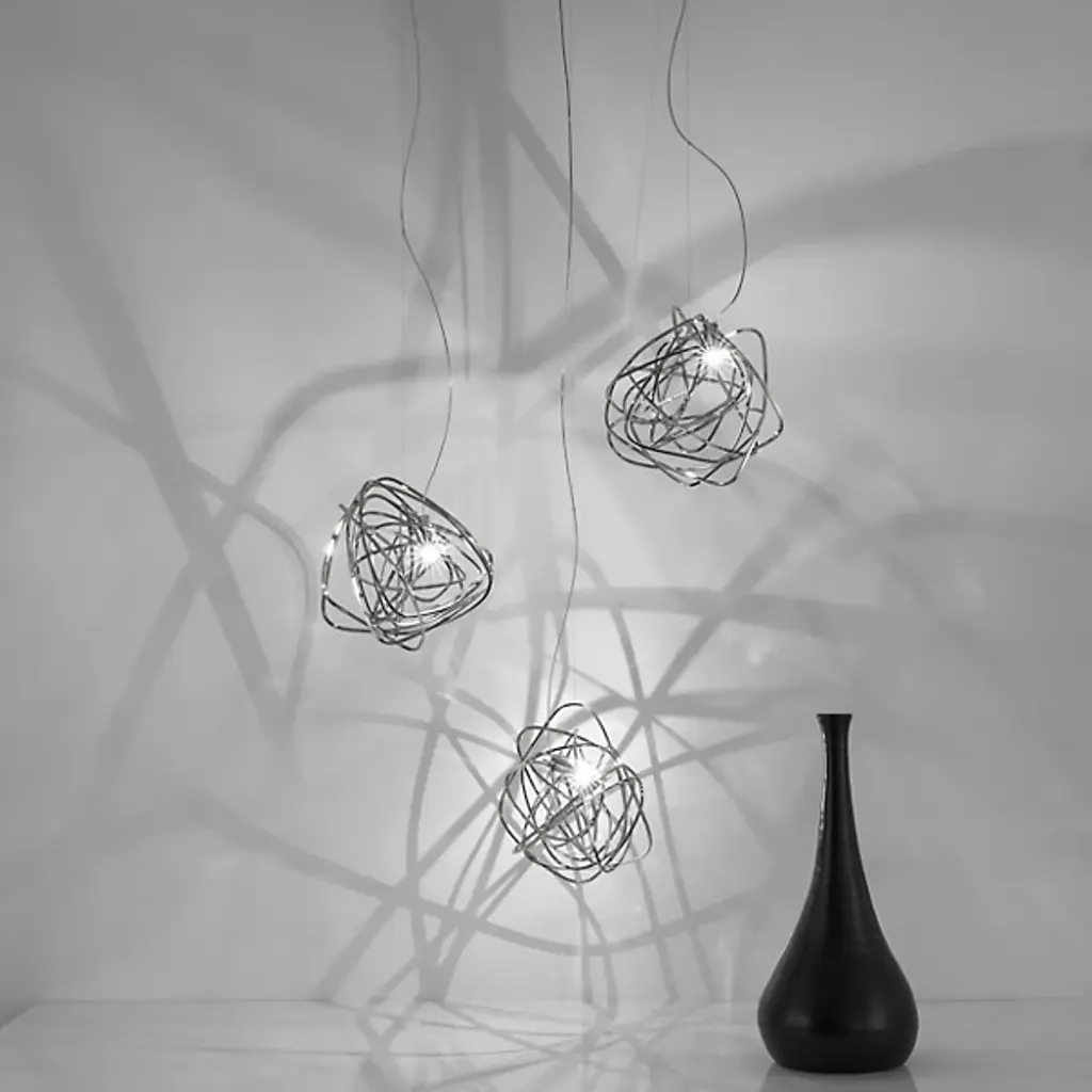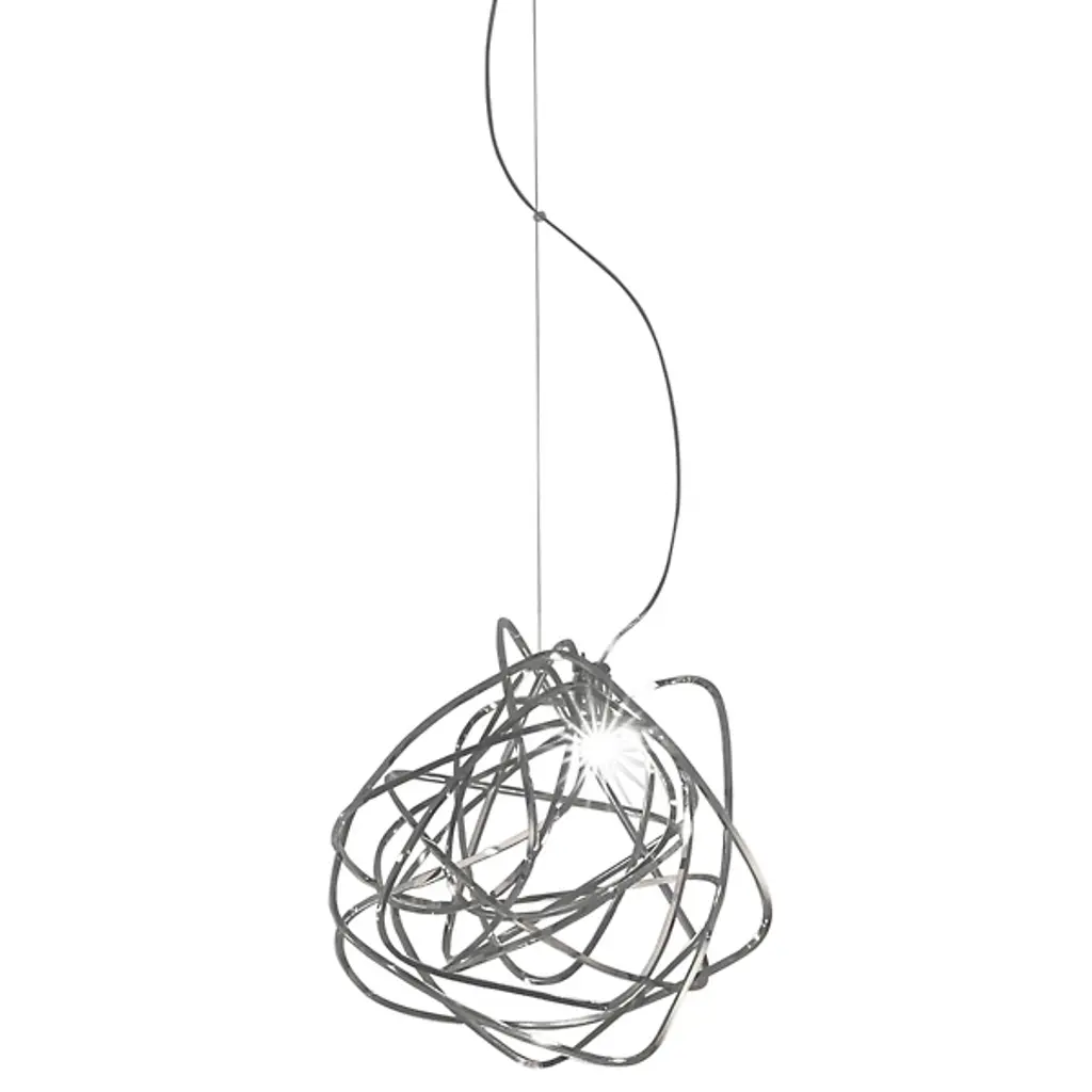 The Terzani Doodle Pendant is contained chaos, featuring a tangled cage of metal wire with a movable light source. Not only can the cable suspend the fixture in any orientation, the small bulb can be adjusted with a metal clip in the same finish, changing the direction and intensity of the light. Once lit, sporadic shadows begin to trace adjacent walls and surfaces, embodying the unpredictable concept of this design.