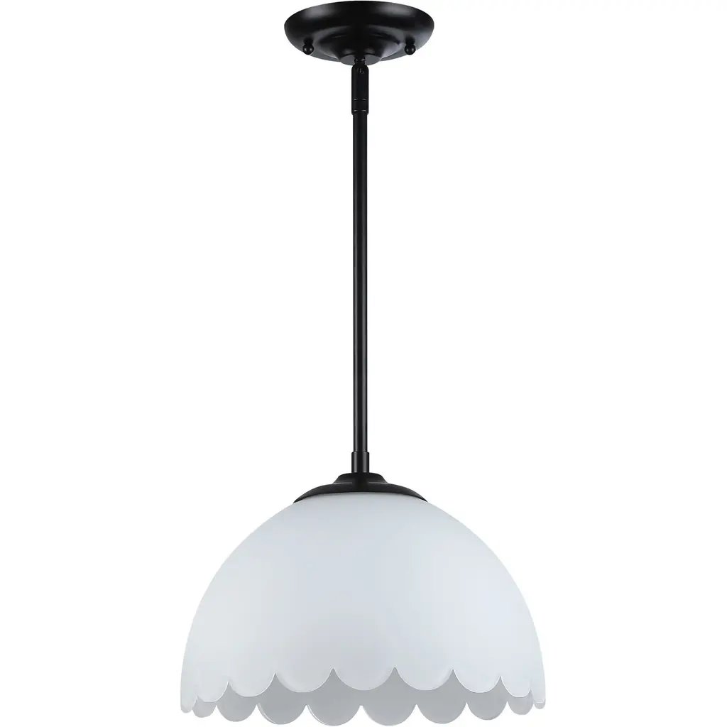 Bring transitional elegance into your home with the Golden Lighting Dorinda 1-light Pendant in Matte Black. Featuring a glass shade and a matte black frame, it creates a welcoming atmosphere. The opal glass shade is designed to diffuse light evenly, providing a soft, glare-free glow that enhances any interior space. Its matte black finish offers a timeless, versatile appeal that complements various decor styles, from minimalist to bold contemporary. Perfect for kitchens, dining rooms, or even entryways, this pendant light is damp location rated, making it suitable for spaces with occasional moisture. Installation is a breeze with its sloped-ceiling compatibility and adjustable height options, allowing you to customize the hanging length from a minimum of 53.875" to a maximum of 8.75". With overall dimensions of 12.25"W x 8.75"H x 12.25"D and requiring one E26 medium base bulb (not included, max 100 wattage), this pendant light is as functional as it is stylish. Illuminate your home with quality and sophistication.