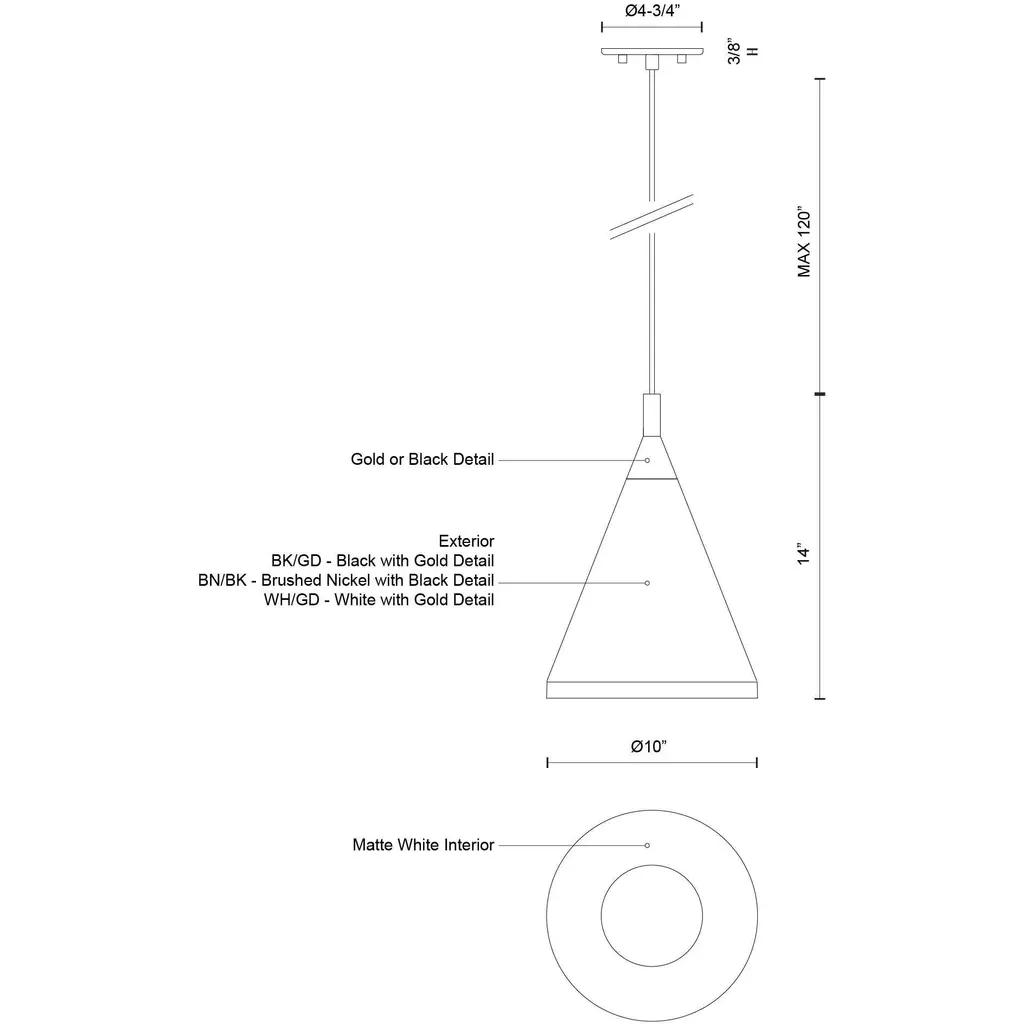 Single lamp pendant with conical aluminum shade with fine powder-coated or plated finishes with contrasting finial. Exterior shade colors are black or white with gold detail or brushed nickel with black detail. Suspended by cloth cable. Available in 3 sizes.