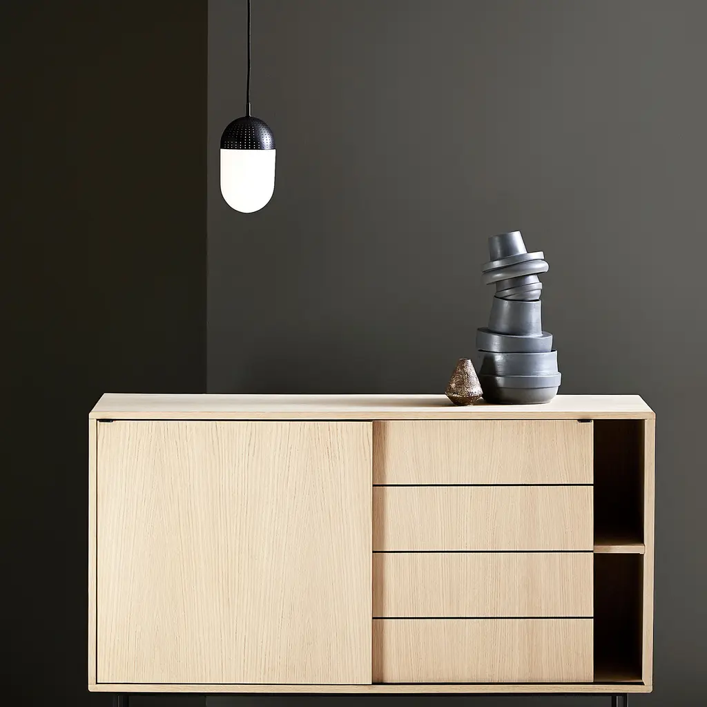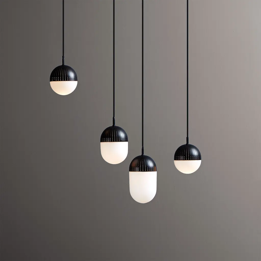 Light up your home with the modern Dot pendants from Danish brand Woud. Inspired by the way small openings in metal sheets can filter light, designer Rikke Frost created the Dot collection with perforated shades. This version features a black metal finish that adds contrast to the opal glass. The white glass softens the light and helps to create a comfortable, laid-back atmosphere in a room. Made with a larger size, this Woud Dot Pendant with a black shade is perfect to use on its own in spacious areas or in a cluster, alongside the medium and small pendants from the same series.