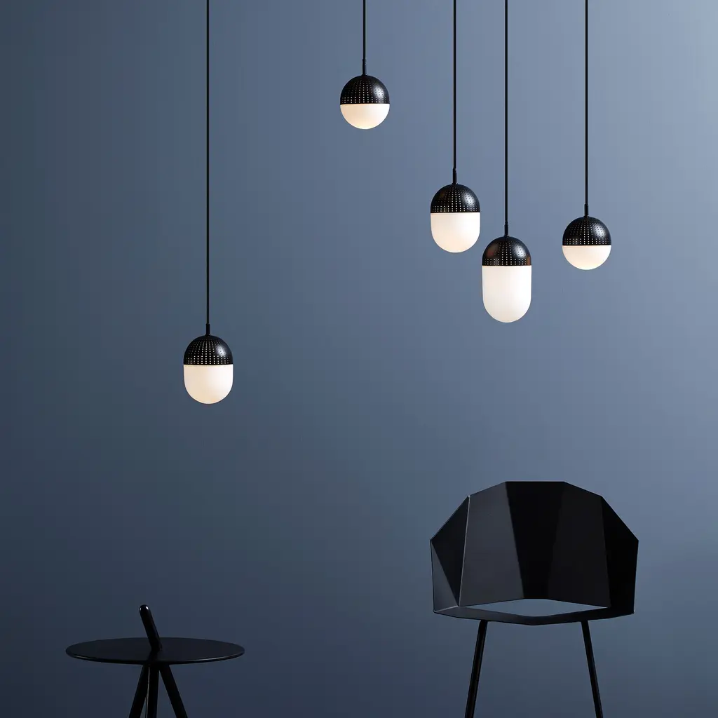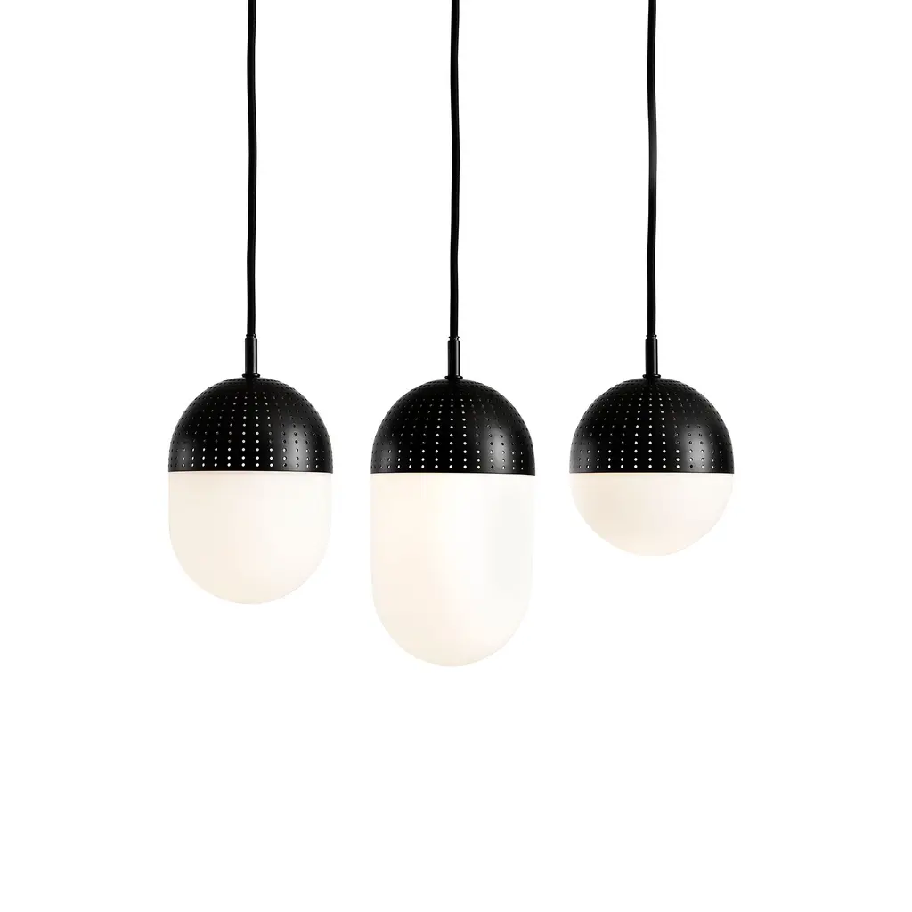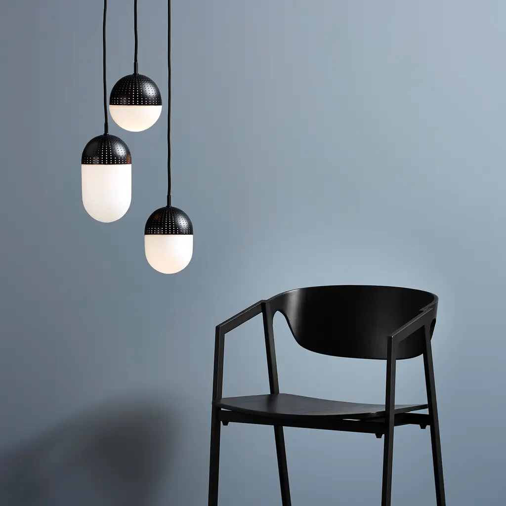 Stylish and contemporary, the Woud Dot pendant light collection offers a creative way to illuminate your home. Designed by Rikke Frost, this medium Dot pendant establishes a dialogue between shadow and light on one hand and between transparency and opacity on the other. The opal glass has a milky white finish which results in a softer, perfectly diffused light and a comforting atmosphere. Above, the metal shade boasts a black finish and perfect perforations that filter the light. And the result? A gorgeous pendant that captures all the attention – whether it’s turned off during the day or lit in the evening. This medium version works well on its own, with matching pendants of the same size, or with the smaller and larger Dot pendants.