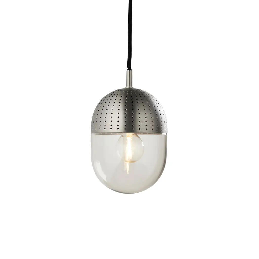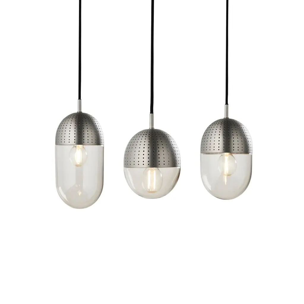 Create a cozy mood in any room with the Woud Dot Pendant light that also magnifies your home’s style. Designed by Danish designer Rikke Frost for Woud, the Dot series explores the combination of complementing materials and finishes in pendants that amplify the beauty of the light with an imaginative twist. The perforated shades cover the top of the smoked glass, filtering the light and highlighting the symmetry of the dot pattern. Made with a medium size, this Woud Dot Pendant has a satin finish and comes with a black suspension cord and a silver gray canopy. Mix and match it with the other two pendant sizes to create a striking composition – in a living room, dining area, or kitchen.
