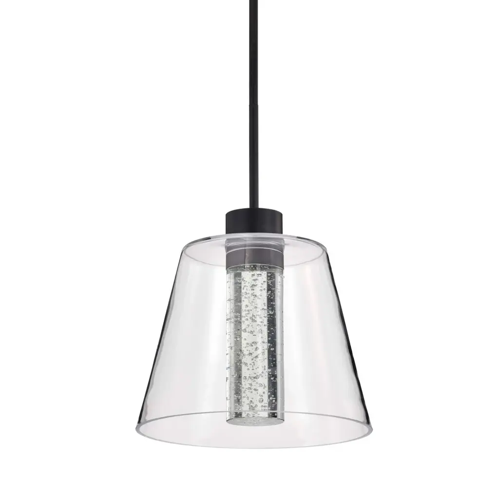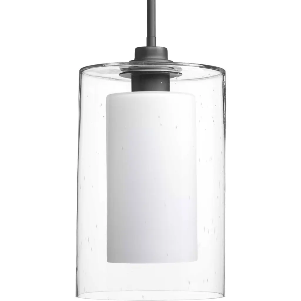 Create a focal point with the Double Glass pendant's vintage-inspired silhouette. Oversized clear seeded outer glass with an inner etched white glass shade complements linear forms in a Polished Chrome finish. Polished Chrome finish.