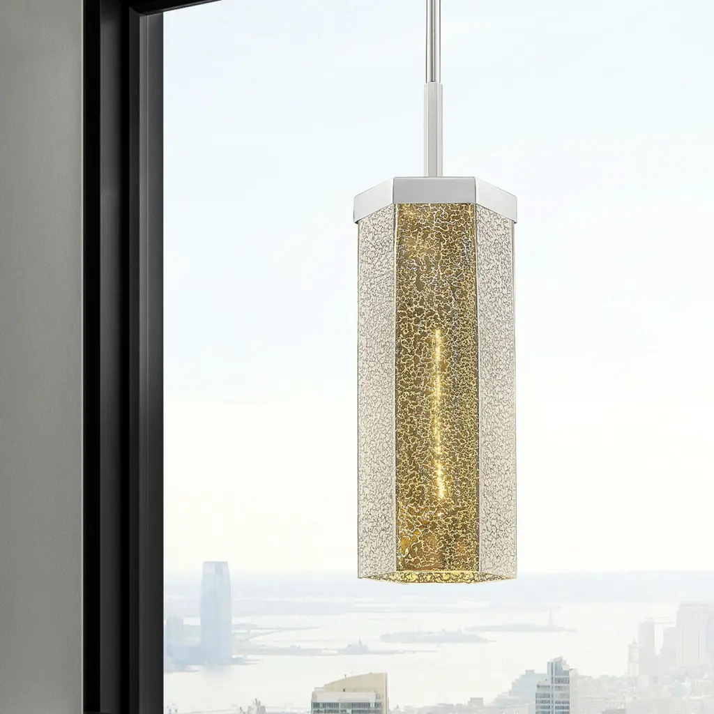 A sophisticated blend of geometry and modern design, this collection features 8" and 12" hexagonal glass shades set within sleek hexagonal metal holders. The polished stem and tail detail, along with a matching hexagonal backplate, create a cohesive design thats perfect for adding a contemporary flair to any space.