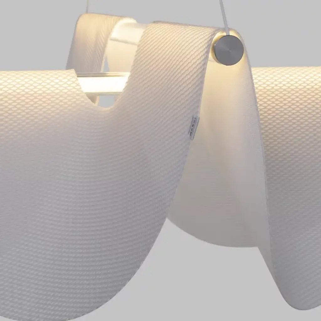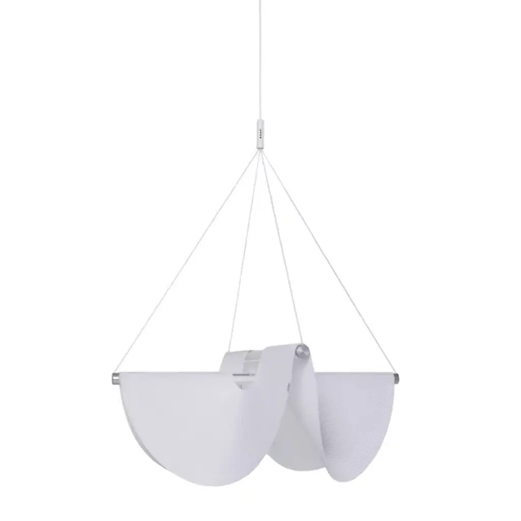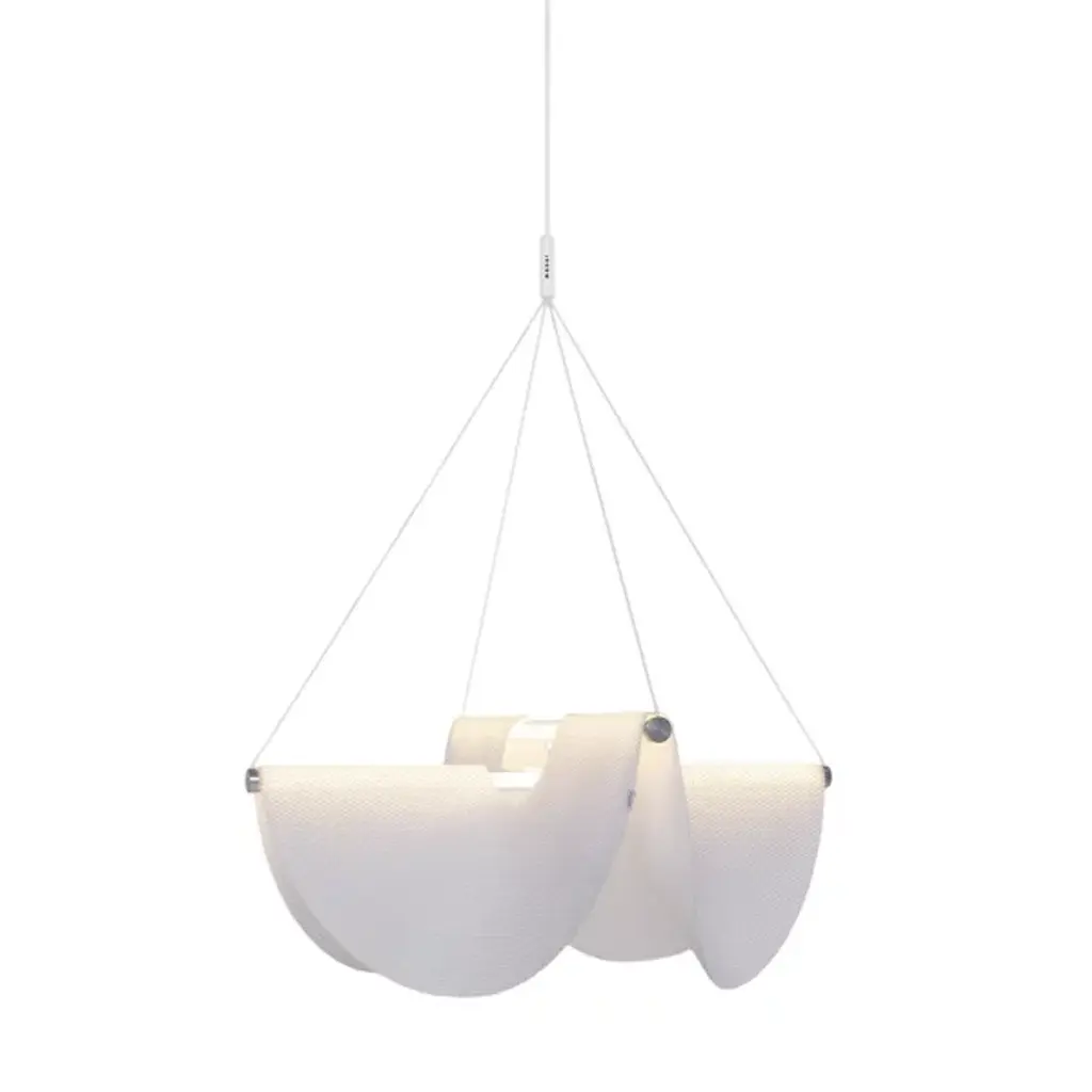 The Drape LED Pendant from Moooi is a clever contemporary design that fuses sculptural appeal with fabulous functionality. Designed by Jamie Wolfond and made in the Netherlands, it suspends from a subdued ceiling mount via slender cables, draping a curving shade of knitted polyester over glass tube lights. Aluminum fittings contain efficient and powerful LED lamping, mellowed into an even warmth by the textured polyester and pulled down by gravity into natural, sculptural forms while scattering ambient light below.
