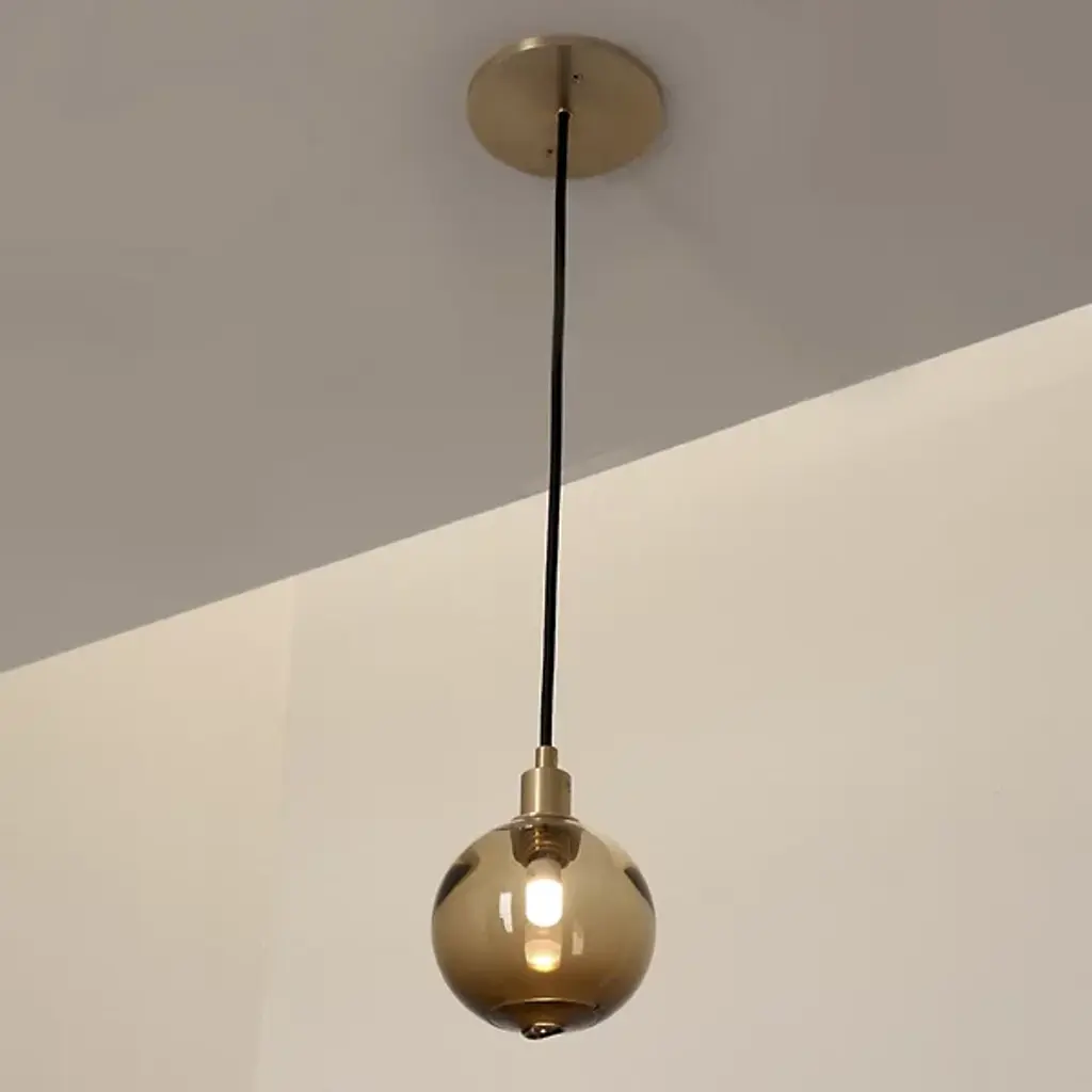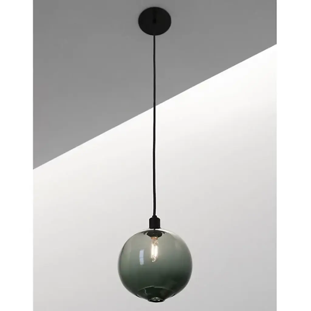 An elegant and minimal piece, the Drape Mini Pendant by SkLO brings an organic visual element and elevated atmosphere to its surroundings. Its distinct combination of modern design and artisanal materials begins with a single fabric-wrapped cord dropping from a circular canopy above. A small sphere made of handblown Czech glass is suspended at the end of the cord, diffusing light in every direction. A fire-polished mouth shows where the glass is broken from the blower’s pipe, enhancing the artisanal effect of the piece. A collaborative design by Karen Gilbert and Paul Pavlak, this piece abstractly explores the idea of giving structure to the relationship between glass and light.