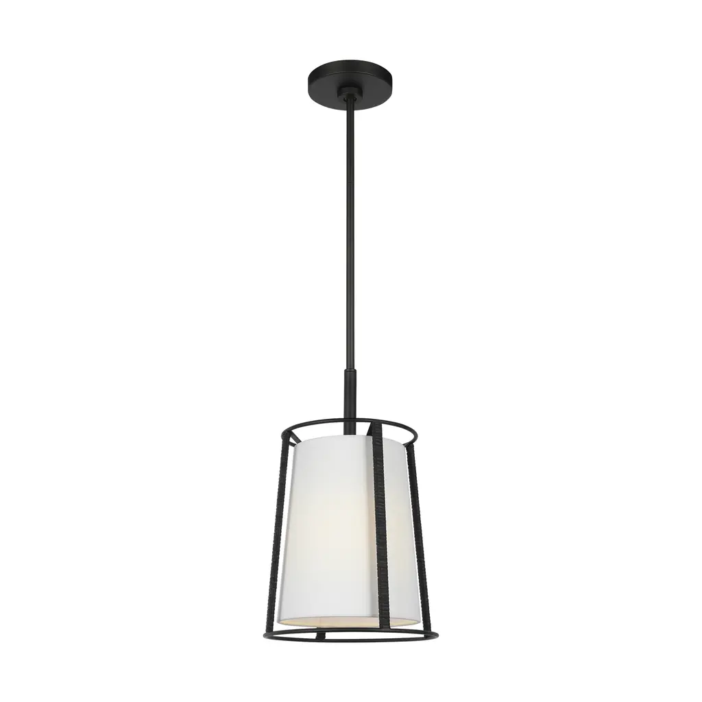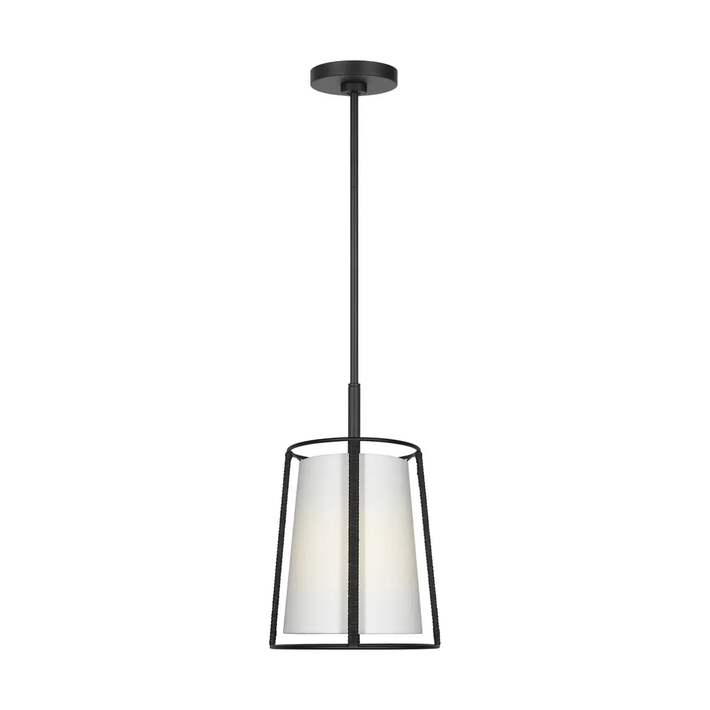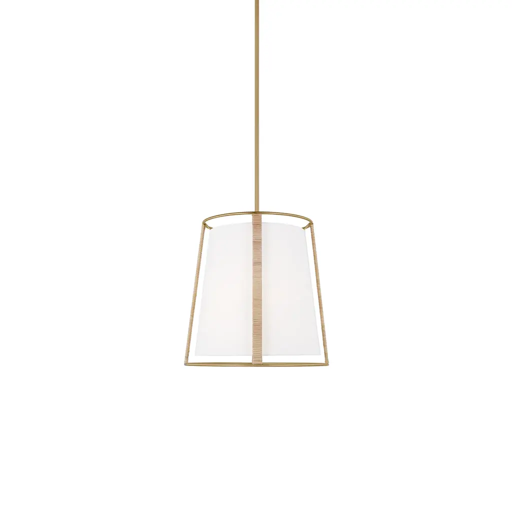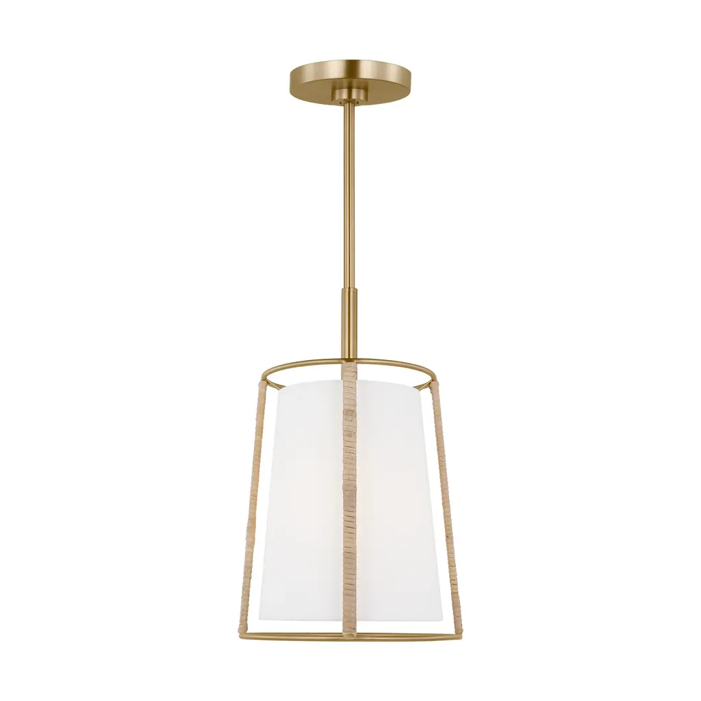 The Drew and Jonathan Cortes Pendant Light from Visual Comfort & Co combines casual elegance with modern design. Its white linen drum shade is complemented by rattan-wrapped steel spokes, forming a tapered, airy silhouette. Finished in warm Satin Brass, this fixture brings a serene coastal vibe to your space. The sleek downrod and circular canopy offer a refined, polished appearance. Damp-rated for versatility, it’s ideal for covered patios, kitchens, or dining rooms. Perfect for coastal, transitional, or bohemian interiors, the Cortes Pendant Light delivers a sophisticated and inviting ambiance. Highlights