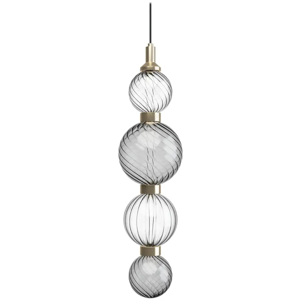 A sophisticated and refined addition to a modern eclectic interior, this pendant lamp belongs to an exquisite collection of captivating lighting fixtures. Mounted on a metal structure showcasing a golden champagne finish, it is composed of five pyrex glass spheres marked by alternating pink, transparent, and bronze hues. This design is completed with a black fabric cable and supports LED lightbulbs. Available in other color combinations, please ask the Concierge for options.