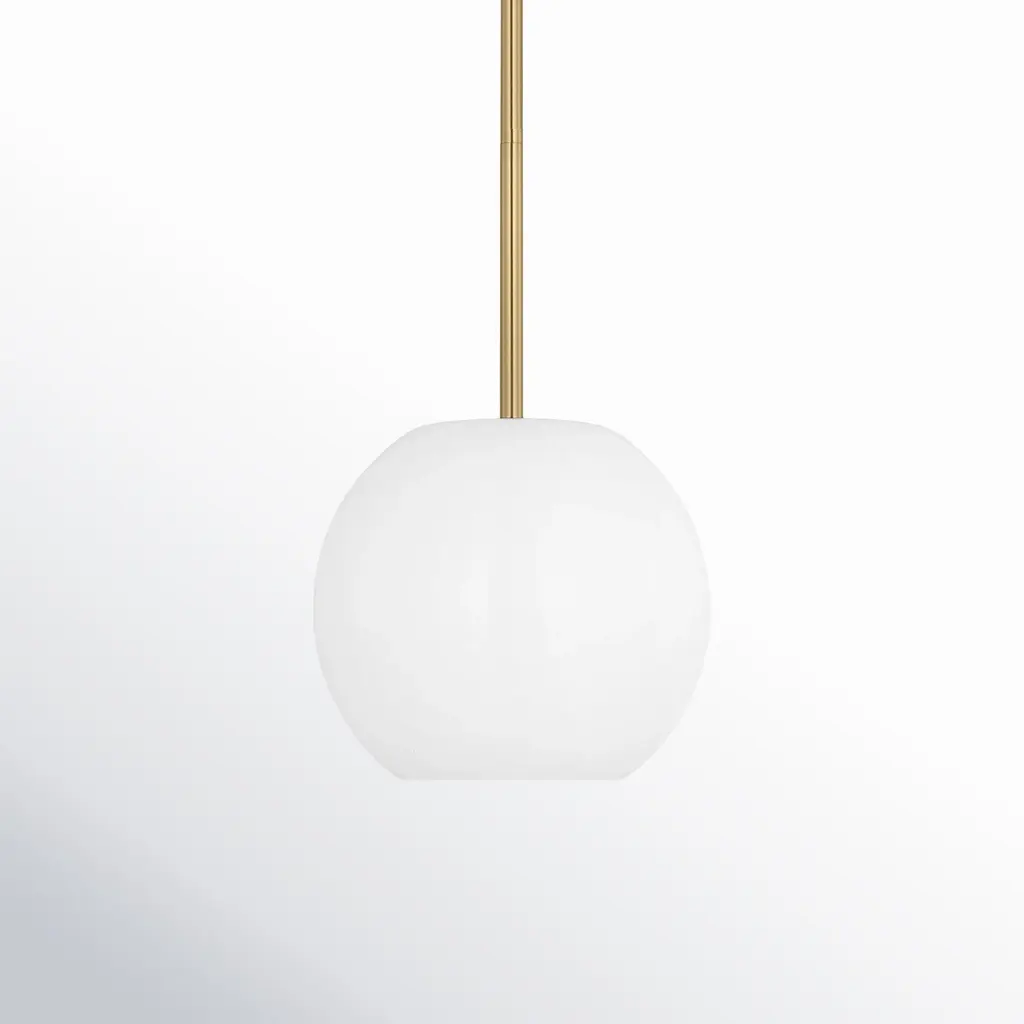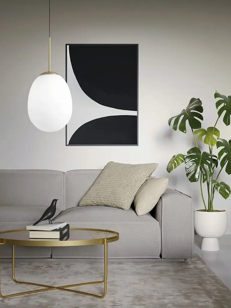 DROP is a suspension lamp with brushed gold or painted matte black frame and ceiling cover. Opal glass diffuser. Black 200 cm power supply cord. Compatible with E27 LED light bulbs. Source E27 LED | Power 1 x max 20w
