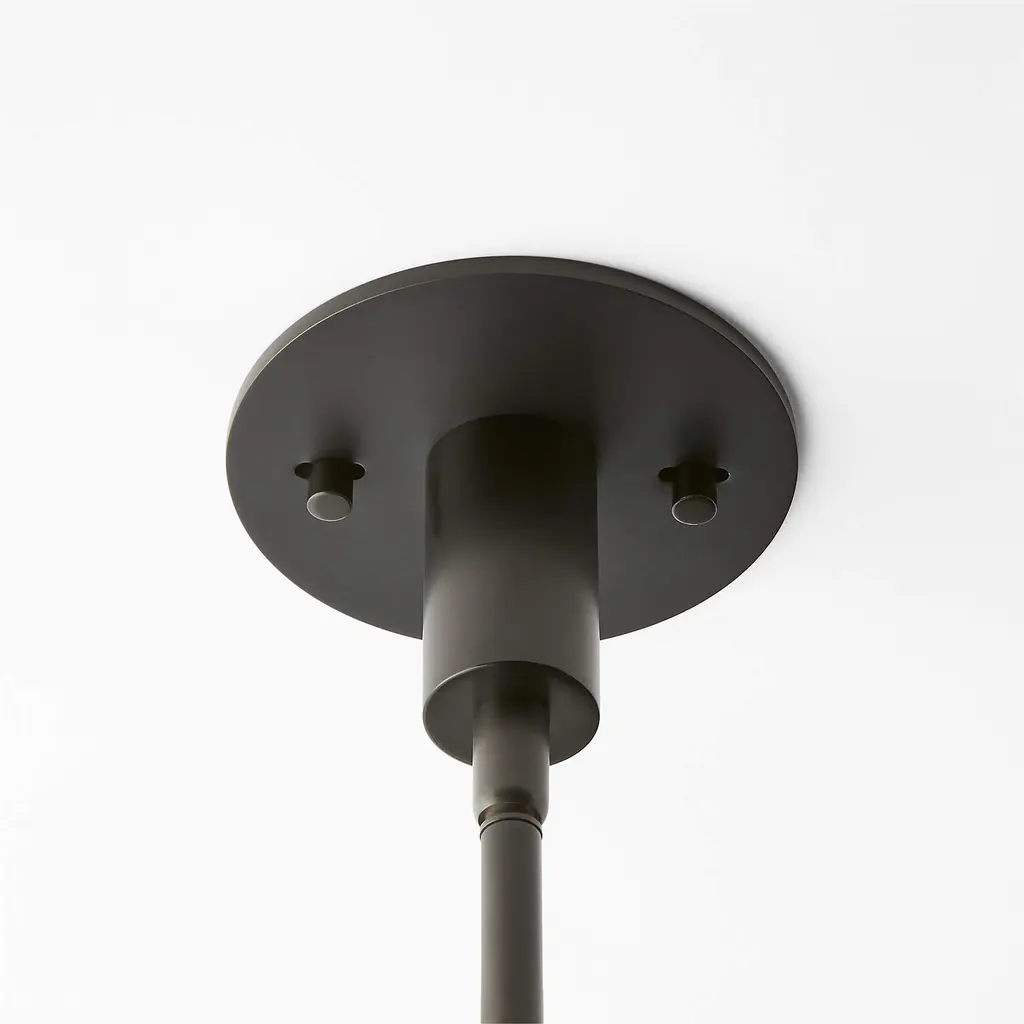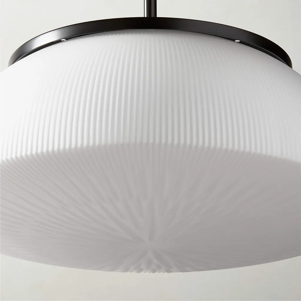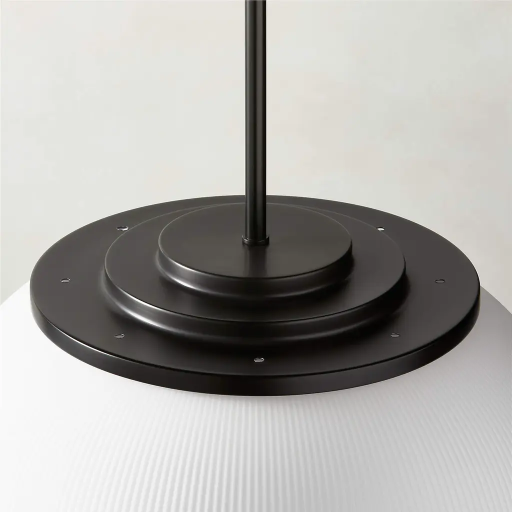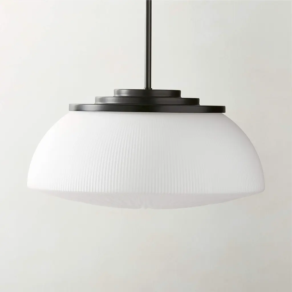 From London-based Studio Anansi, pendant light captures the architectural details and curved silhouettes of the Art Deco era. Matte black rod supports a contrasting ribbed glass shade that's frosted to gently diffuse light. Perfect for illuminating the kitchen or bathroom. CB2 exclusive.