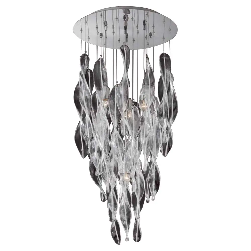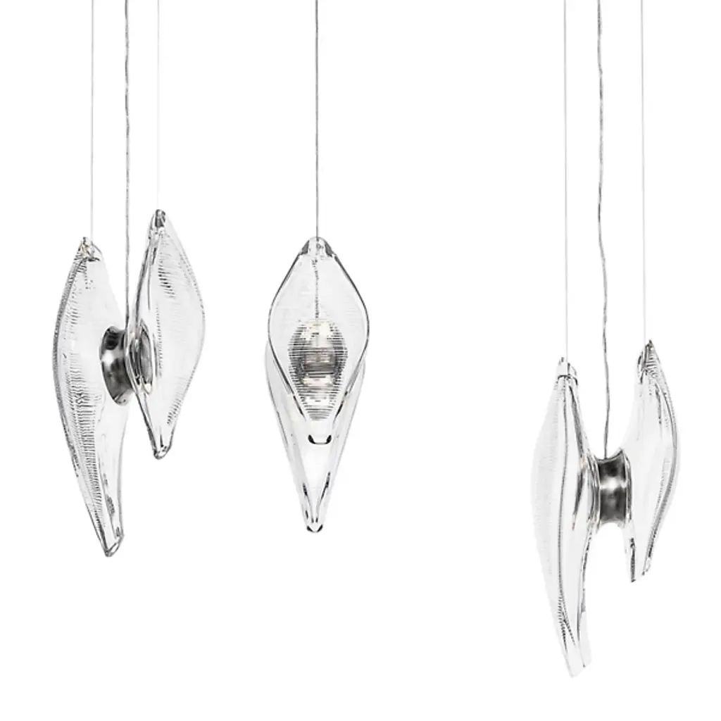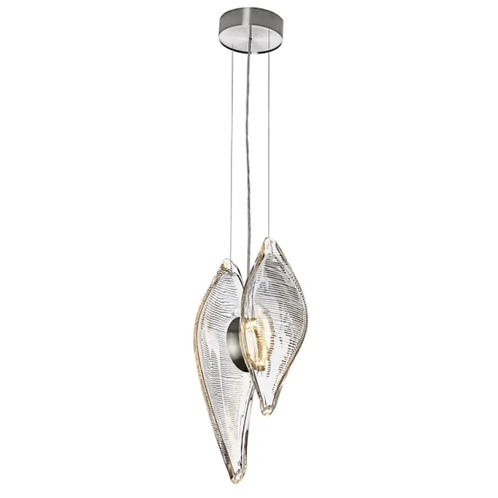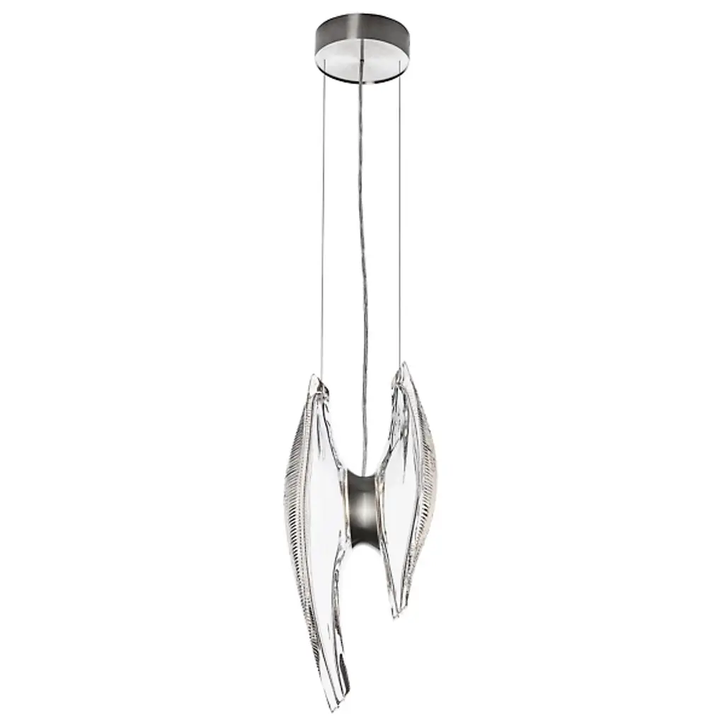 Enhance inside ceilings with the evocative desert power of the Duna LED Pendant from Lasvit. It’s a layered, creative design that brings to mind the abstract, organic lines of desert dune formations. It suspends a contoured vertical ring of anodized aluminum from a disc-shaped canopy, setting internal LED lamping inside it and supporting textured, organic forms of blown clear glass with a striated surface to either side with slim, strong cables. The powerful, energy-efficient lamping blazes out to the sides, gentled by the thick, translucent glass into a vibrant, even glow.