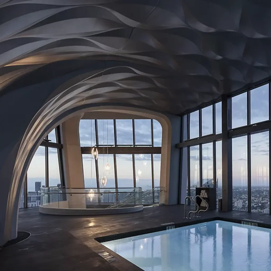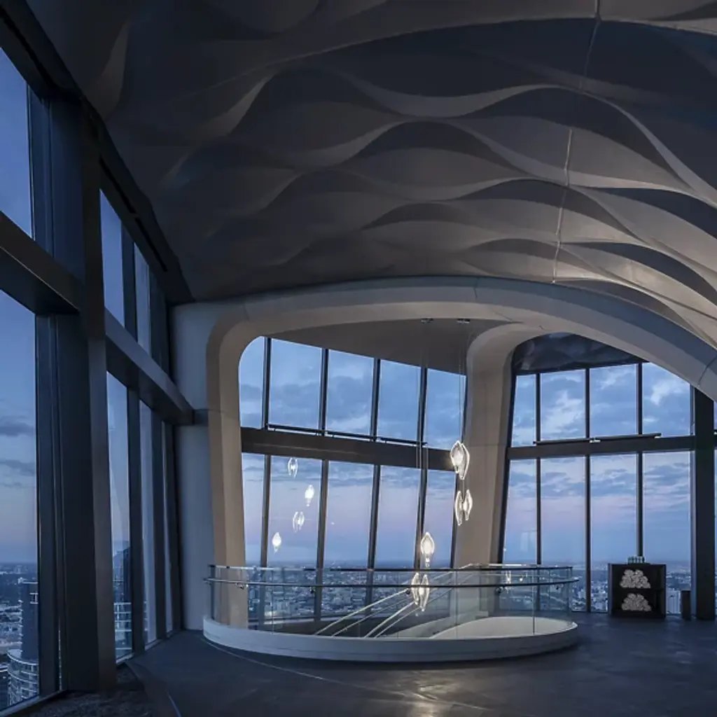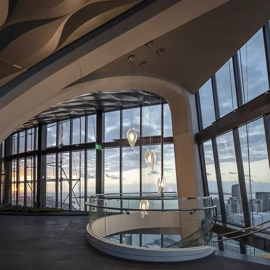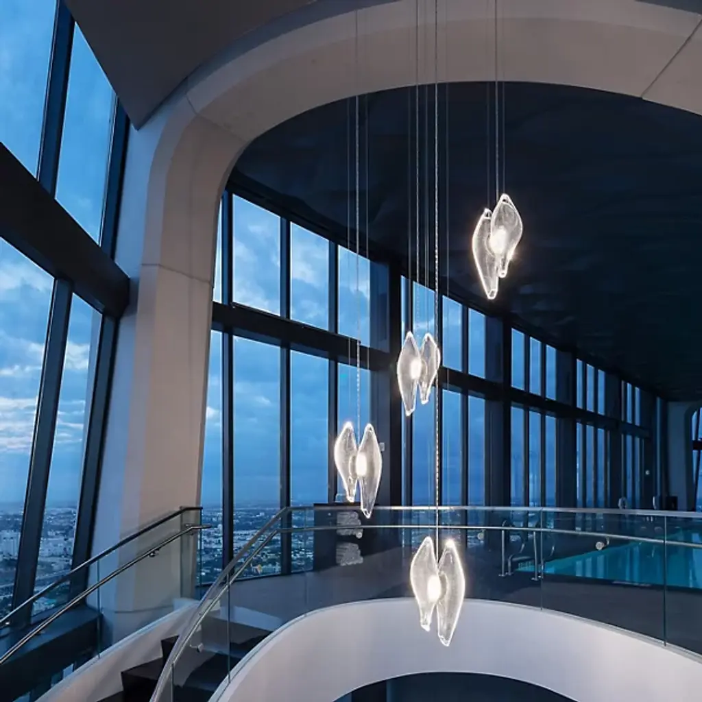 Enhance inside ceilings with the evocative desert power of the Duna LED Pendant from Lasvit. It’s a layered, creative design that brings to mind the abstract, organic lines of desert dune formations. It suspends a contoured vertical ring of anodized aluminum from a disc-shaped canopy, setting internal LED lamping inside it and supporting textured, organic forms of blown clear glass with a striated surface to either side with slim, strong cables. The powerful, energy-efficient lamping blazes out to the sides, gentled by the thick, translucent glass into a vibrant, even glow.