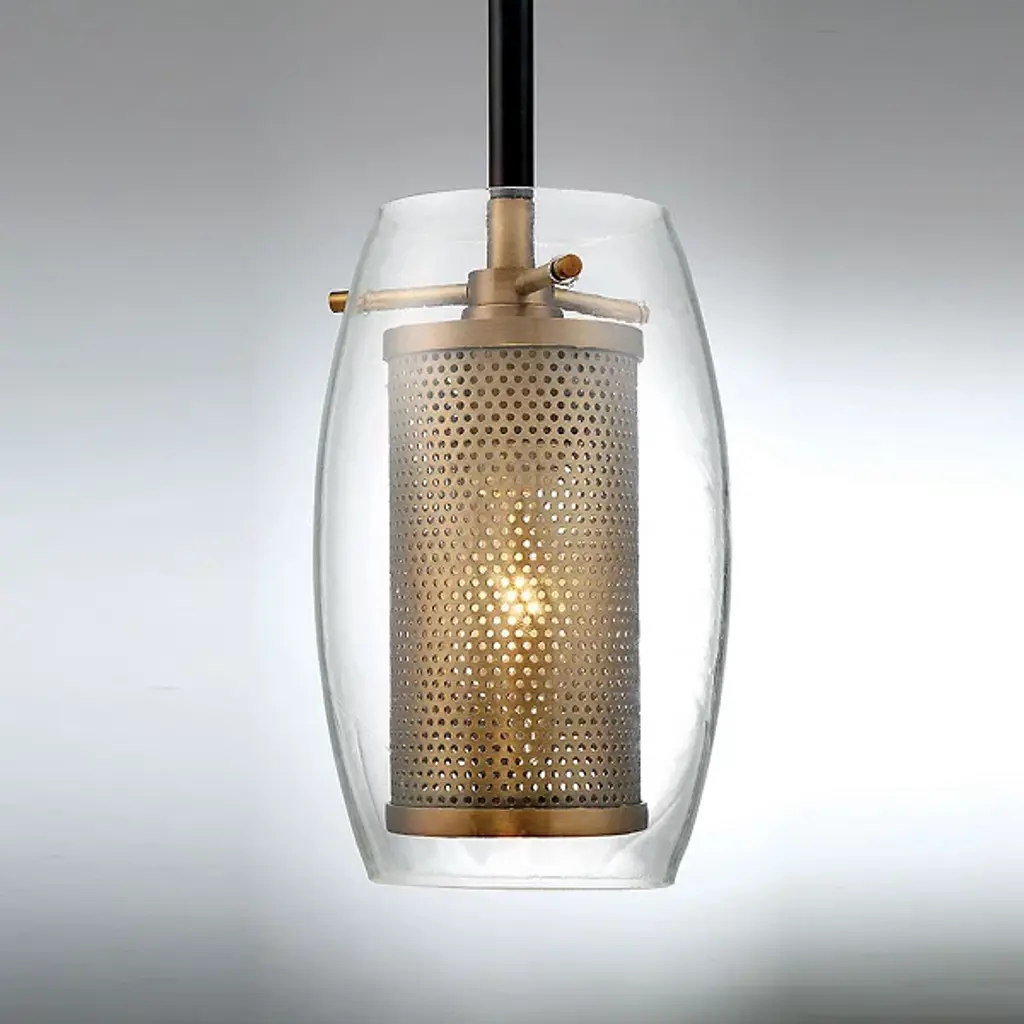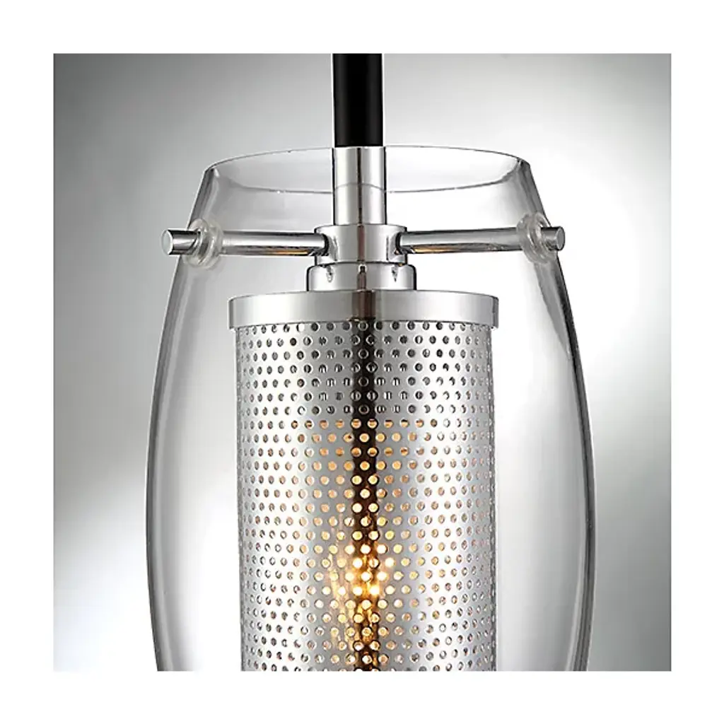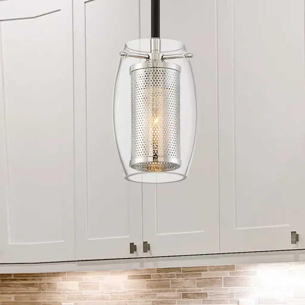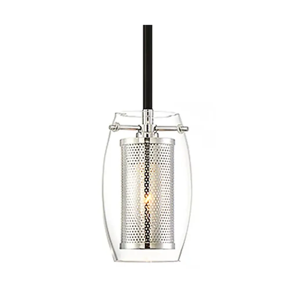 Illuminate your space with the sleek industrial style of the Dunbar Mini Pendant by Savoy House. The mesh inner shade is surrounded by a striking oval of clear glass, while the two-tone metallic finish with matte accents provides depth and an added luxurious vibe. Install this pendant in a dining area or living room and instantly boost the clarity and beauty in your home.