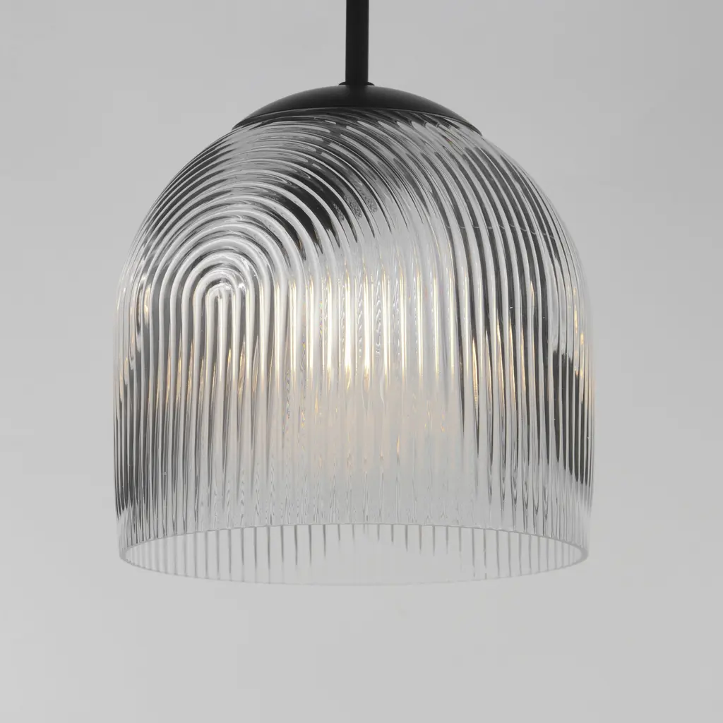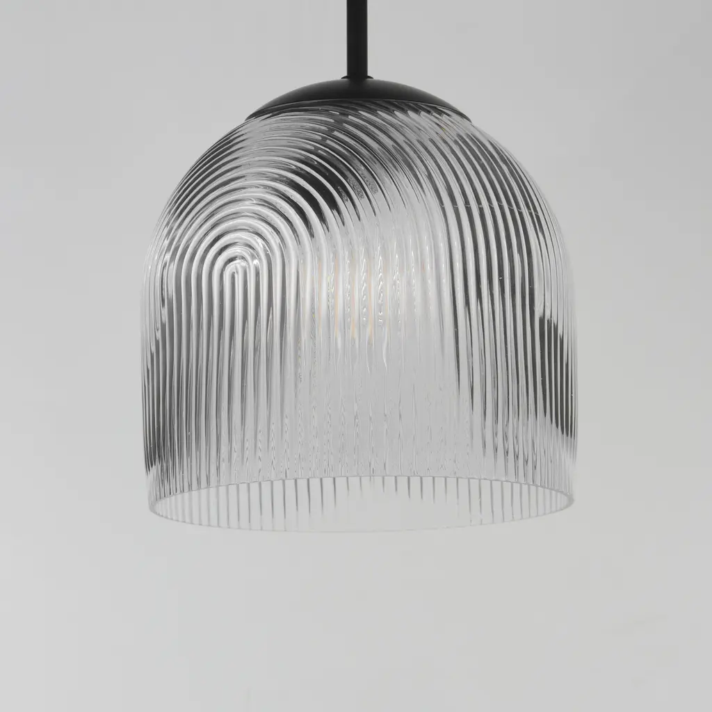 Featuring a concentric, semicircular ribbed glass pattern, this collection offers a blend of familiar design with contemporary flair. The deeply textured glass refracts light beautifully, diffusing glare while delivering ample functional illumination. Metal accents in a Matte Black finish enhance the modern aesthetic. Available in oversized pendant and flush mount configurations, the collection is ideal for larger spaces, combining bold design with practicality.