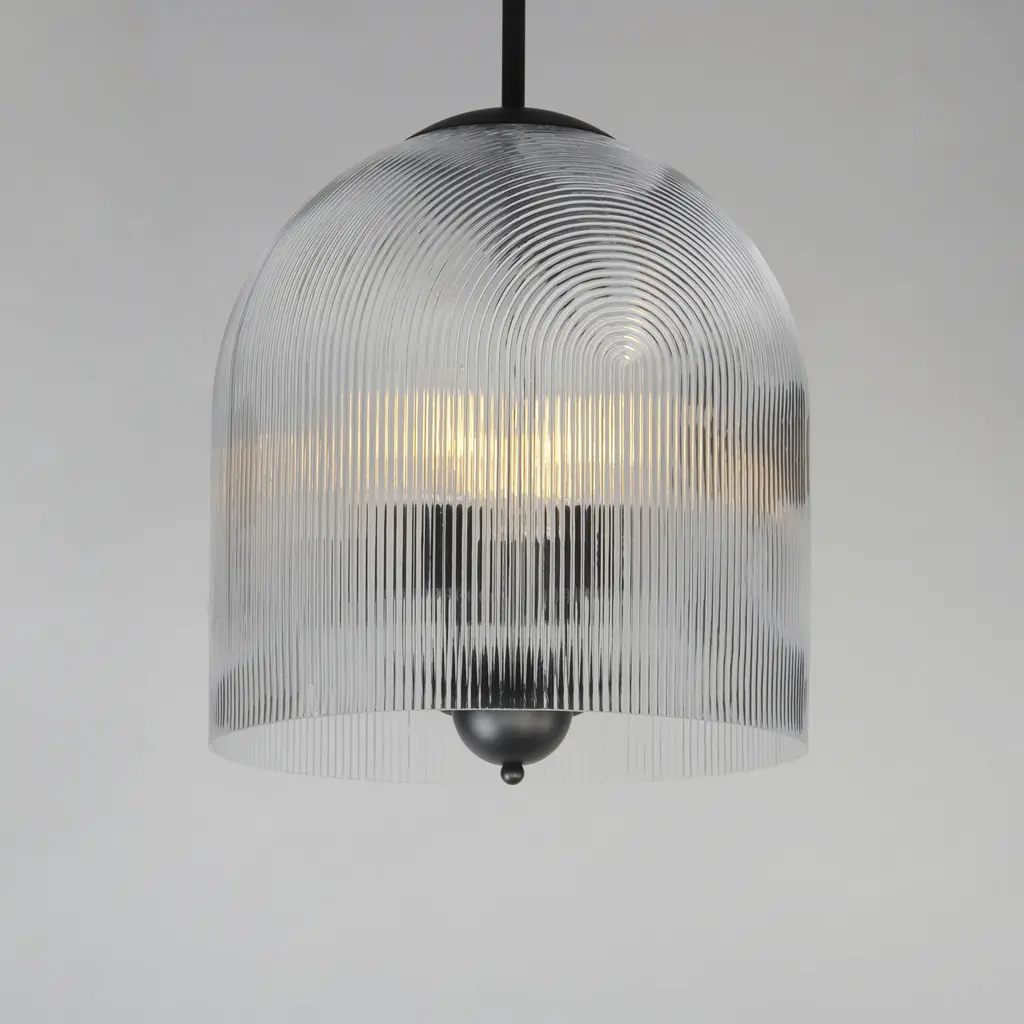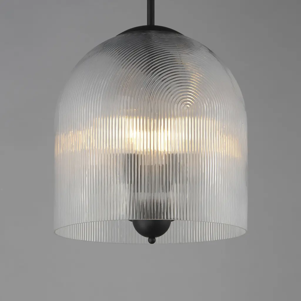 Featuring a concentric, semicircular ribbed glass pattern, this collection offers a blend of familiar design with contemporary flair. The deeply textured glass refracts light beautifully, diffusing glare while delivering ample functional illumination. Metal accents in a Matte Black finish enhance the modern aesthetic. Available in oversized pendant and flush mount configurations, the collection is ideal for larger spaces, combining bold design with practicality.