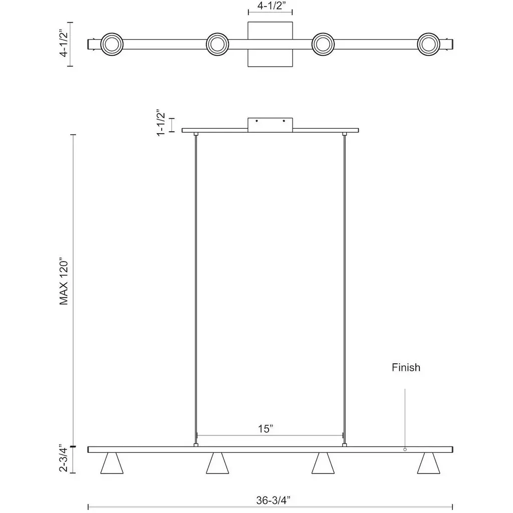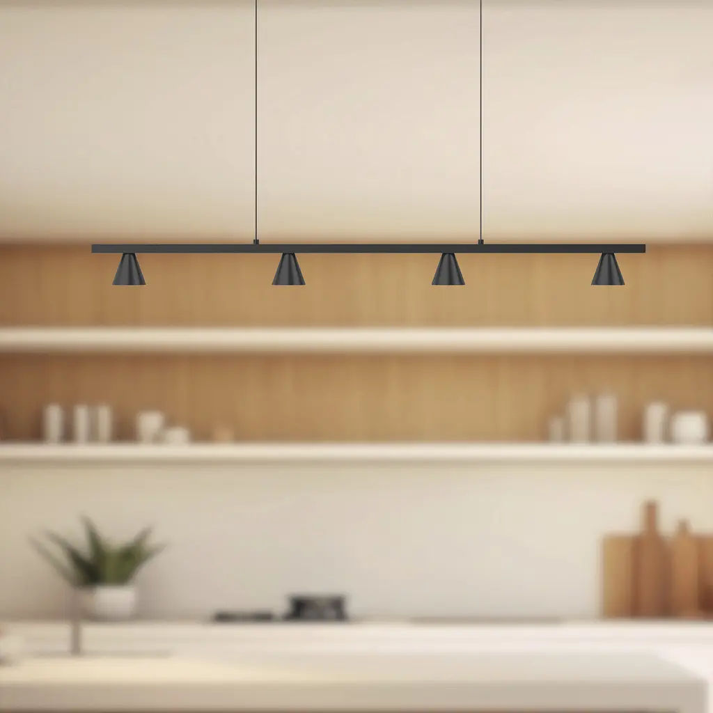 Multiple aluminum cones are connected inline and direct light downwards from the geometric linear pendant. The Dune series utilizes classic minimalist lamp shapes yet in reduced scale to elegant effect. The LED spot sources are focused by diminutive reflectors housed within the exquisitely turned shades. Available in multiple configurations and finishes.
