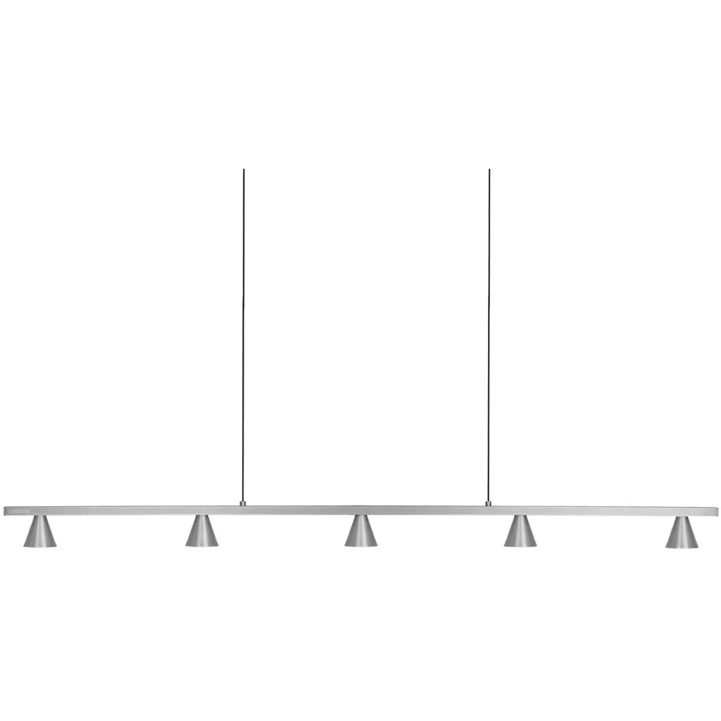 Multiple aluminum cones are connected inline and direct light downwards from the geometric linear pendant. The Dune series utilizes classic minimalist lamp shapes yet in reduced scale to elegant effect. The LED spot sources are focused by diminutive reflectors housed within the exquisitely turned shades. Available in multiple configurations and finishes.