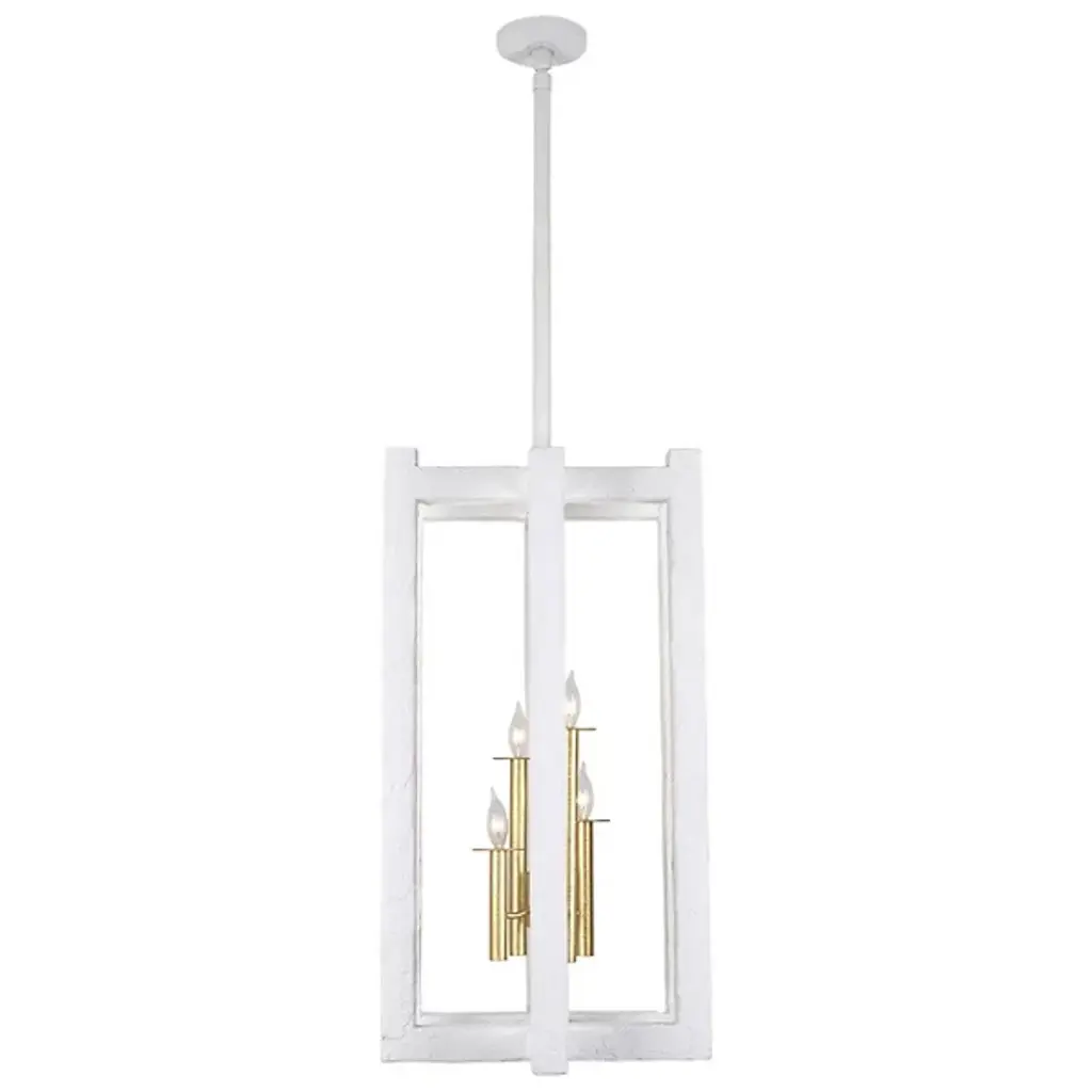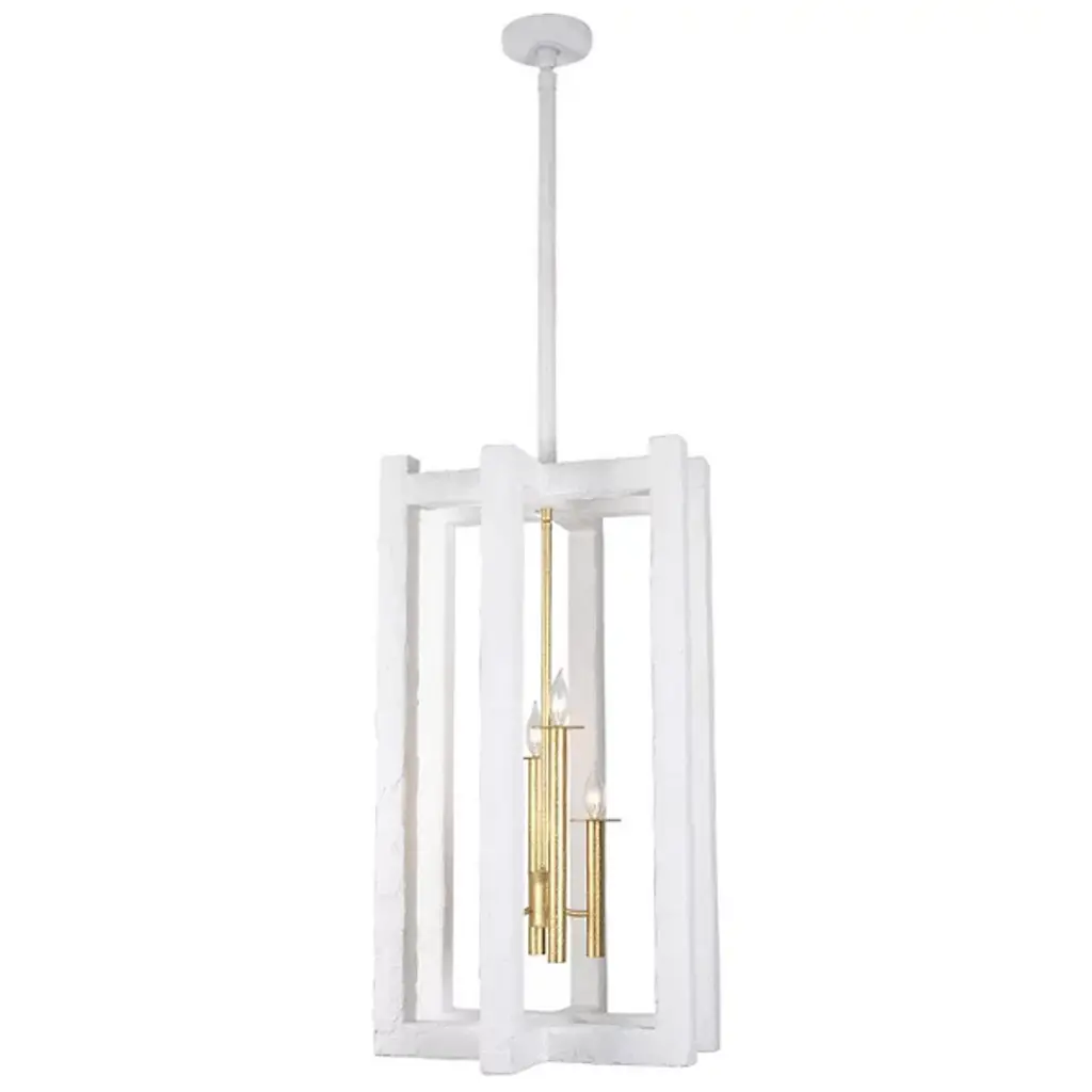 Enhance open living spaces with the Duo Pendant from Kalco Lighting. The open design draws inspiration from the textural beauty of desert adobe dwellings, featuring a sophisticated dual-finish design—a matte white exterior paired with soft gold candelabra sockets. The gentle, ambient glow creates an inviting atmosphere, while its transitional style bridges modern aesthetics and traditional design elements. The softness and warmth of the fixture delight, bringing desert-inspired serenity to any room.
