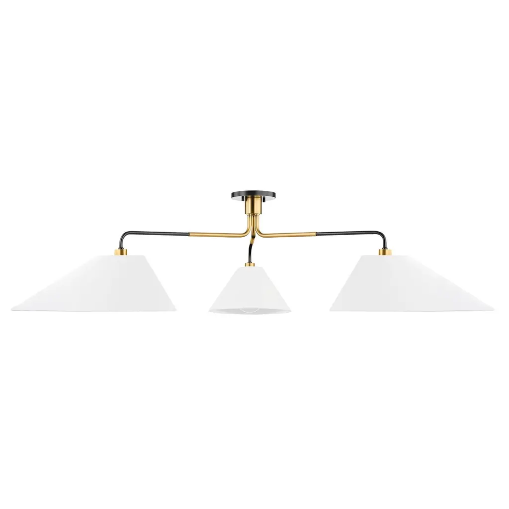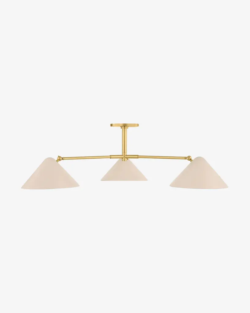 The Duo Semi-Flushmount from Hudson Valley Lighting is a lively addition to the room, offering sleek modern outlines and generous light. The piece moves with a sense of precision best suited to the refined aesthetic. Its compact canopy and low-profile composition of arms make for a natural look over the short ceiling. These arms catch the eyes with a shiny and matte combo of finishes. Angular shades cut across below with a soft linen construction that makes them feel visually light and balanced. The wide-spreading shades help eliminate glare from the sides. Their wide openings also help distribute plenty of cozy downward illumination.
