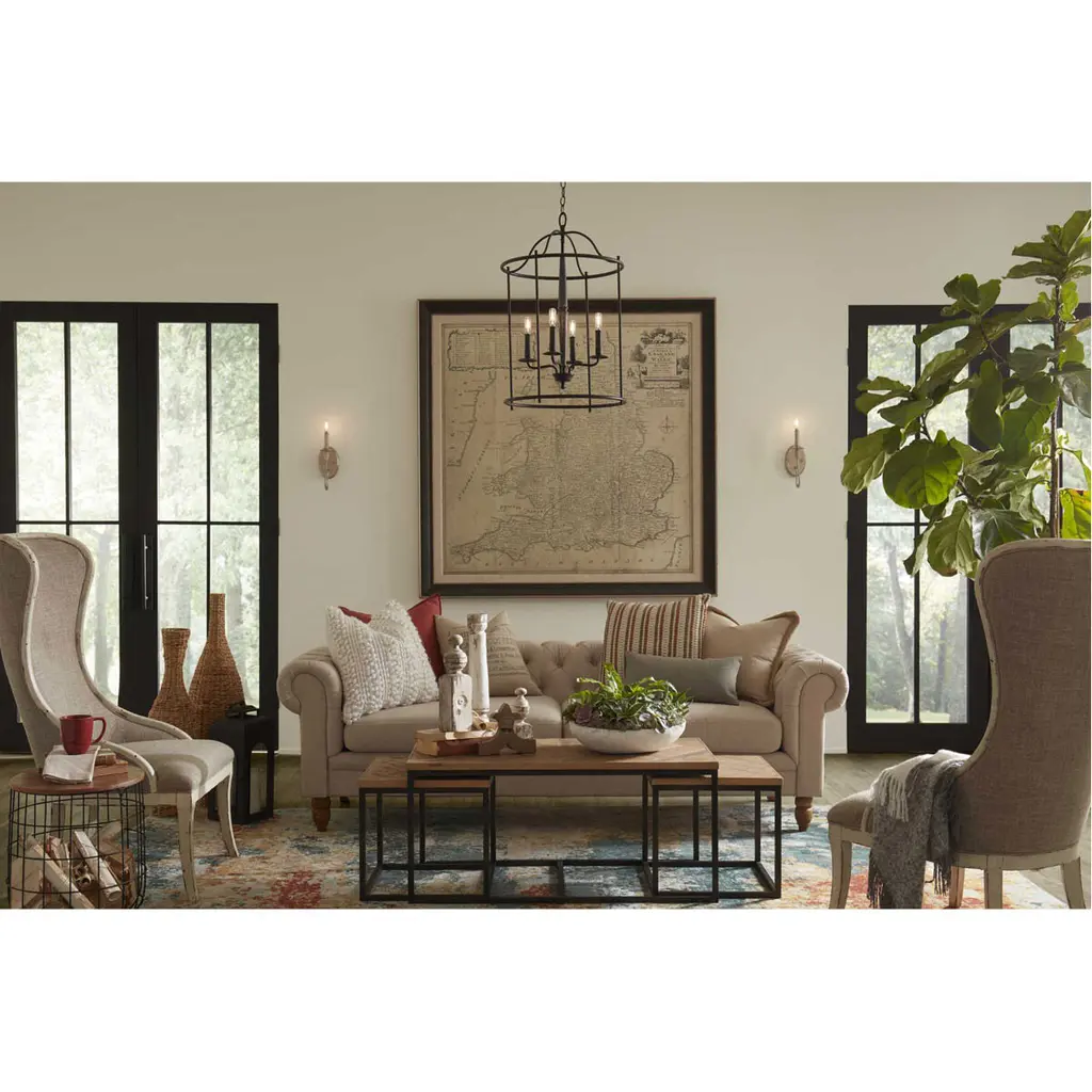 This versatile foyer light from the Durrell Collection will easily find a home in a variety of settings in need of generous illumination. An elongated, open-cage frame coated in a farmhouse-style black finish adds visual height to the design. Inside the frame gathers light bases on gently curved arms ready to emit a friendly glow. At the light fixture’s center is a graceful wooden column coated in a cerused black finish.