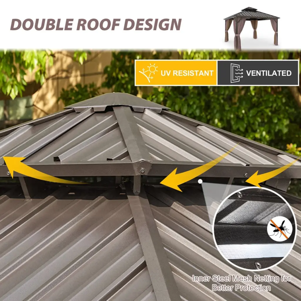 Eagle Peak 12'x12' Aluminum Frame With Steel Double Roof Hardtop Gazebo, Brown